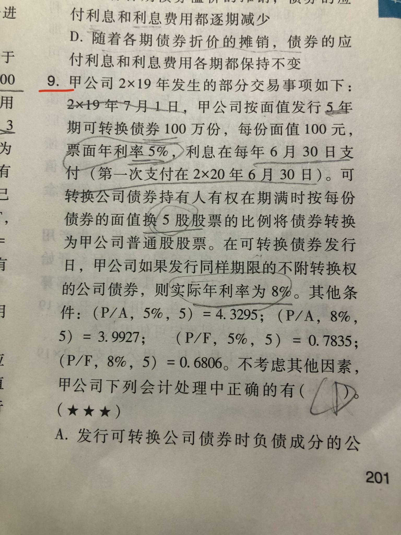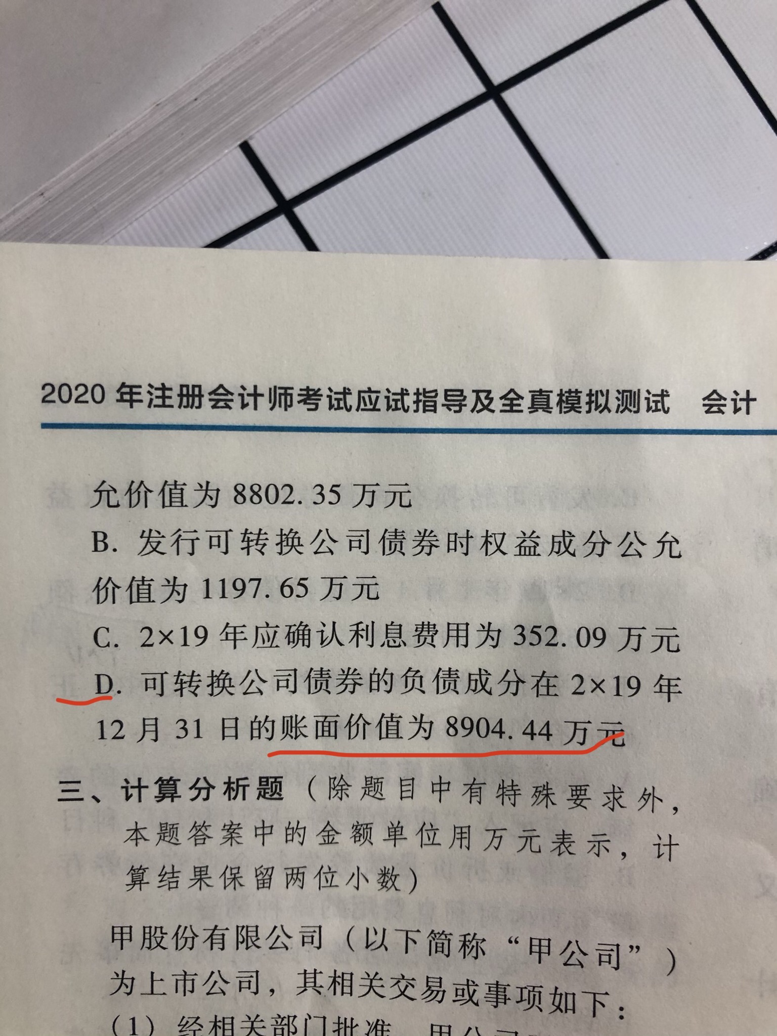 这个题目里账面价值其实就是期末的摊余成本,期末摊余成本=期初摊余成本+本年利息费用-票面利息,因此我们根据这个式子和上面选项的结果可以得出D选项的列式和结果