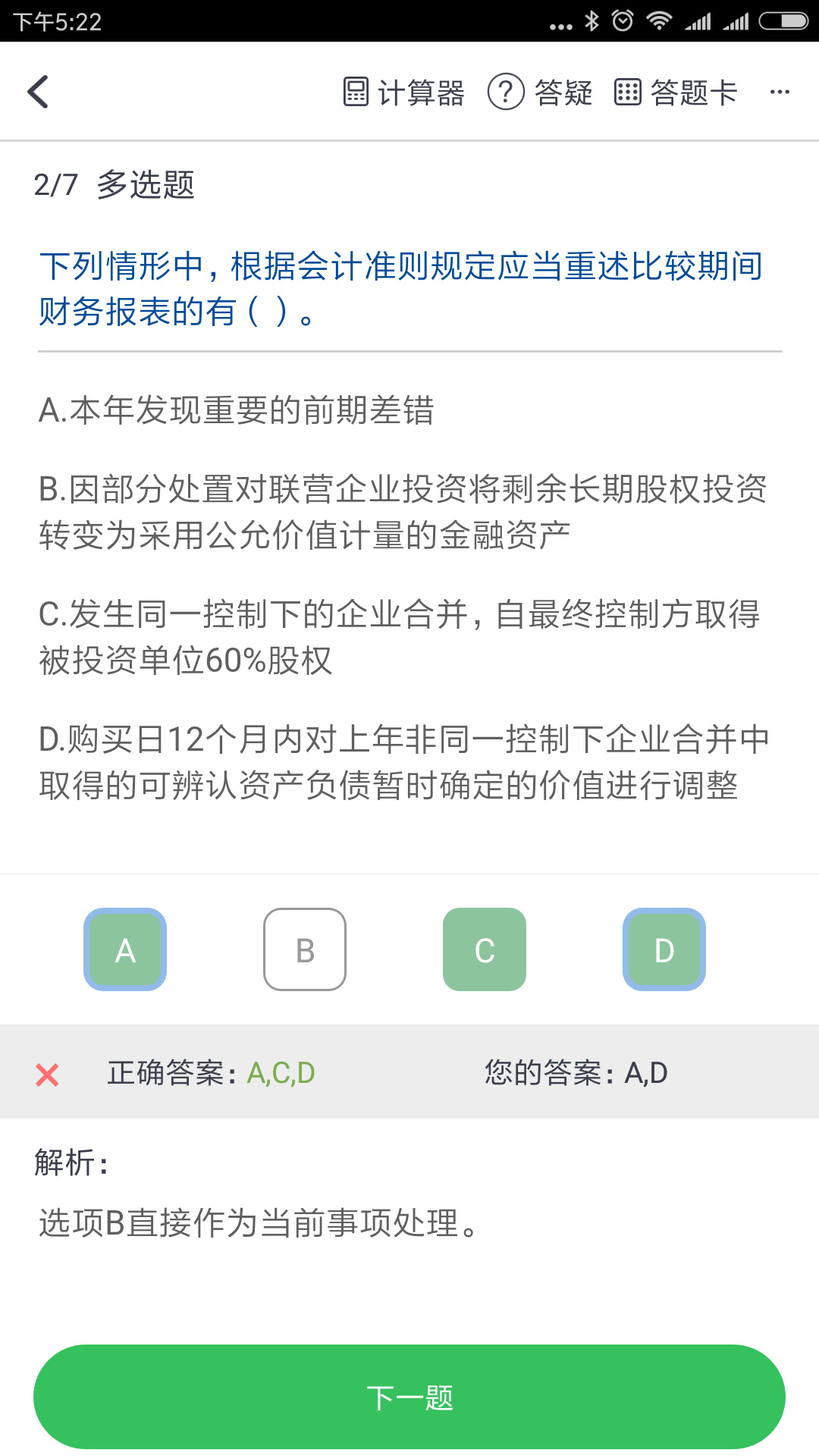 举个例子,加工资有两个子公司,乙公司和丙公司,乙公司从甲公司手里买了丙公司60%的股权,实现同一控制,就是选项C描述的情况。