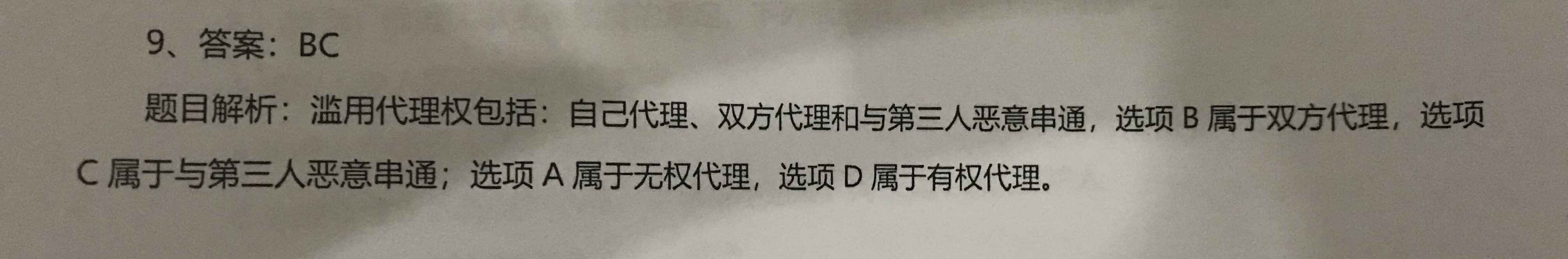 老师。下面这道周测题答案是不是不对?我看了周测讲解视频,里面是让选择属于滥用代理权的,但是老师的讲解B选项是双方代理我还是没理解,我的疑问是,1、B是滥用代理权但不是双方代理?首先题目甲公司受乙公司委托,那甲是受托方,乙是委托方,那么AD,乙(委托人)以甲名义(受托人)都应该是无权代理,B选项,乙公司(委托人)从丙(受托人)处购买那丙才是自己代理,不是双方代理吧?双方代理应该是甲即代表乙又代表丙才是双方代理吧?第2个疑问、C选项乙公司(委托人)与丁公司串通卖货给甲(受托人)这C没有代理权,而且与丁恶意串通,到底是无权代理还是恶意串通?不知道我的理解哪里出错了?请老师指导一下谢谢!