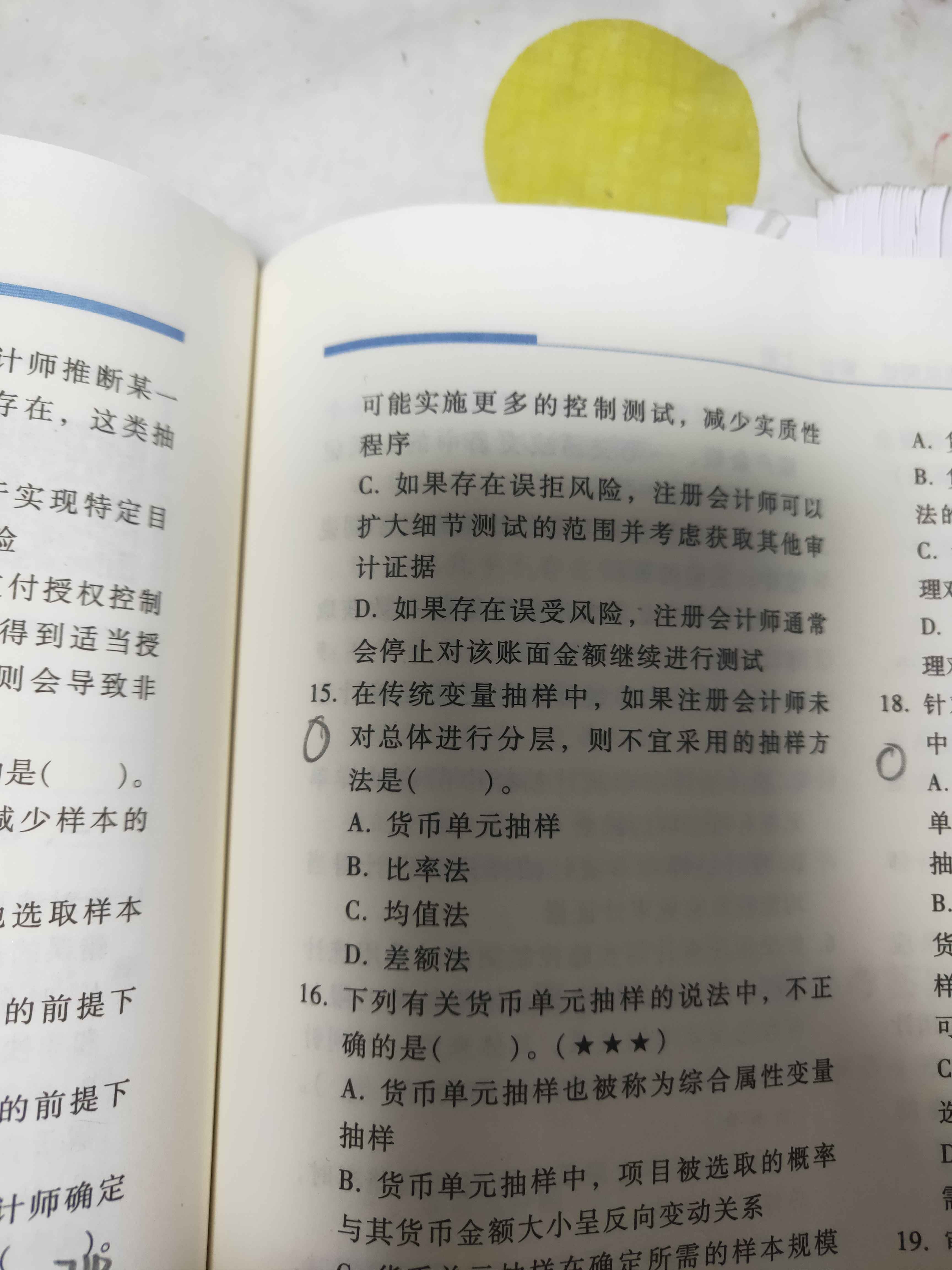 至于选项A,货币单元抽样,根本就不属于传统变量抽样,不符合题干要求~