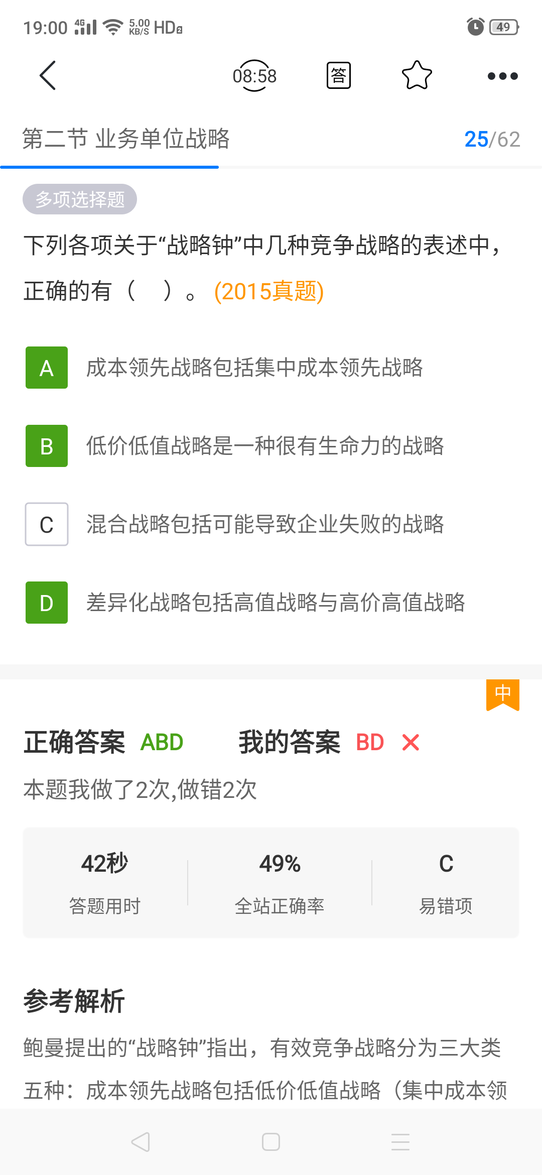 A选项说反了吧?应该是集中化战略包括集中成本领先和集中差异化。