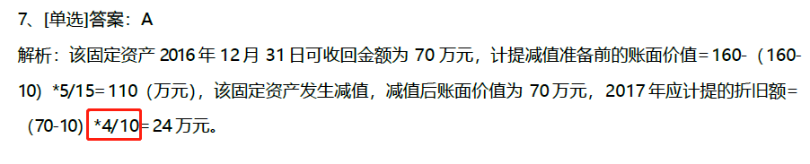 因为发生了减值,减值后的要新的价值和年限计提折旧,减值后剩余使用寿命为4年,因此分母是4+3+2+1=10年,继续加油!