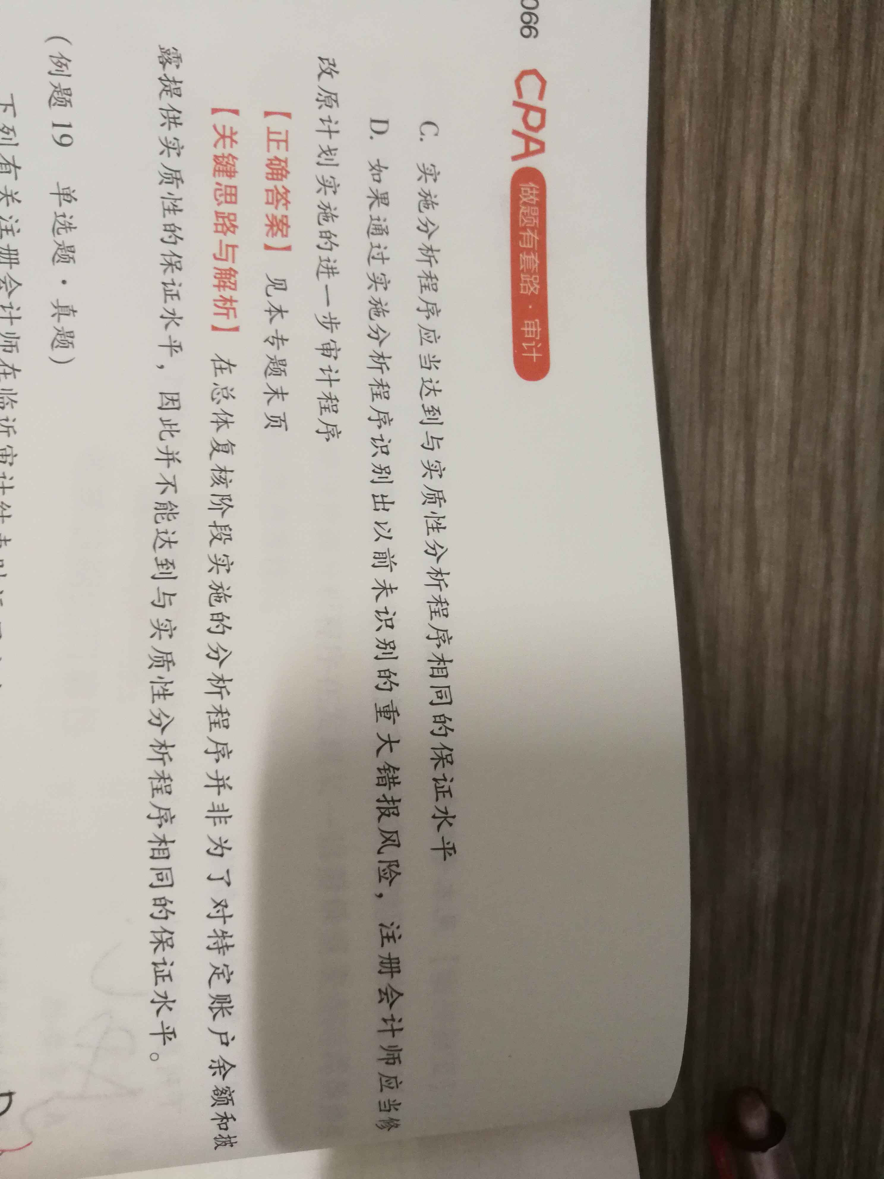 选项C应当结合题干理解。题干讲的是总体复核阶段的分析程序。选项C的意思是:总体复核阶段实施的分析程序应当达到与实质性分析程序相同的保证水平。而这是不正确的。总体复核阶段实施的分析程序不对特定账户余额和披露(认定层次)提供实质性保证,所以不能与实质性分析程序提供的保证水平进行比较。