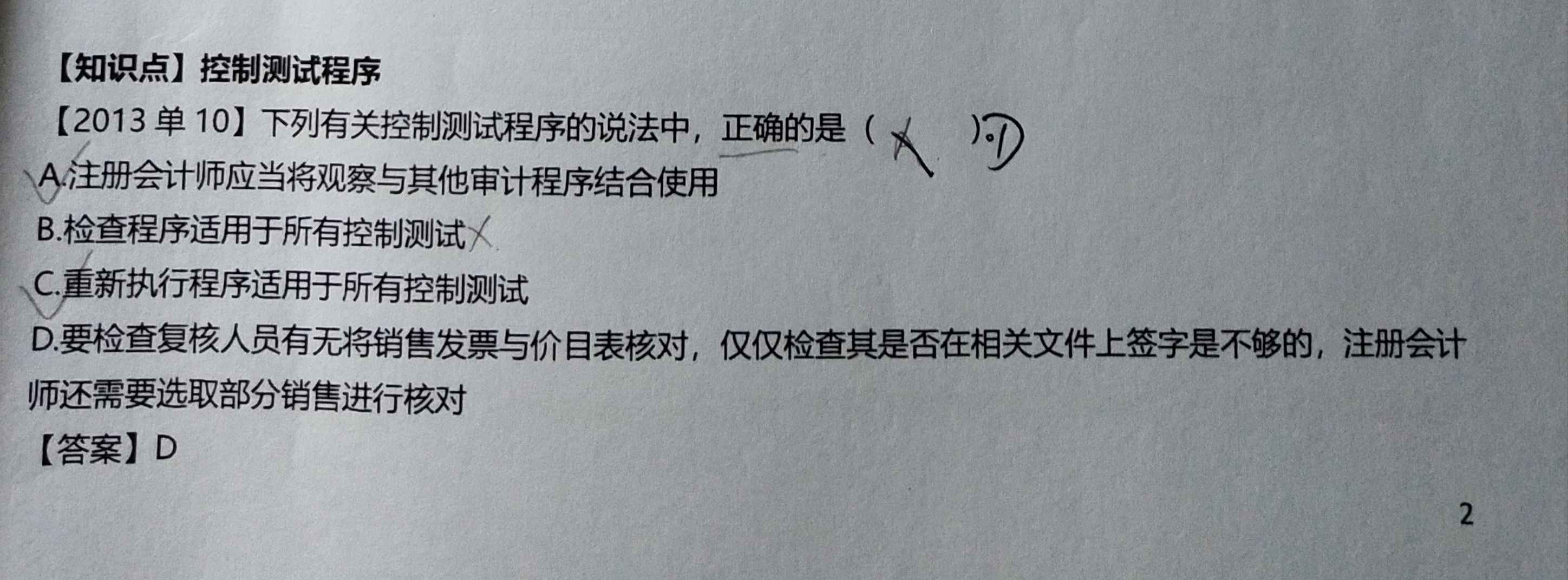 1、A,注册会计师应当将‘询问’与其他程序结合使用。C,重新执行程序由于成本高,并不是在所有控制测试中都会使用。只有当其他程序都不能获取充分适当审计证据的时候,才会使用重新执行程序。