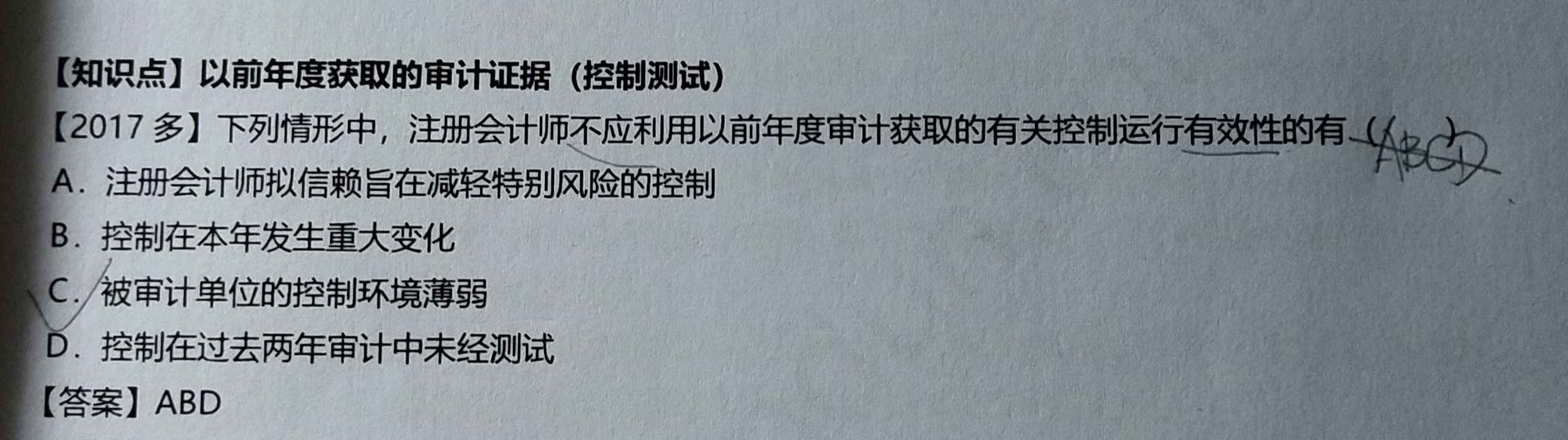 2、这道题原题是“注册会计师不应利用以前年度获取的有关控制运行有效性的审计证据的有”,问的是‘关于控制运行有效性’获取的审计证据,是否能够利用。C选项‘控制环境薄弱’也是一种对控制环境获取的一份证据,它能够证明‘控制无效’。