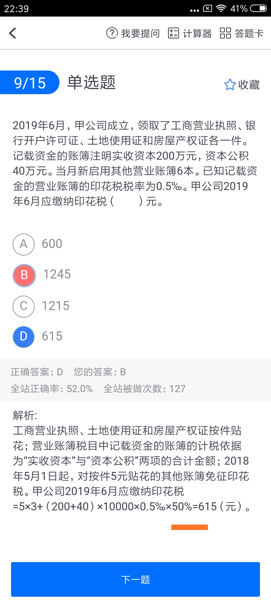 因为记载资金的账簿2018年起这个印花税减半征收,所以这道题要从乘以50%