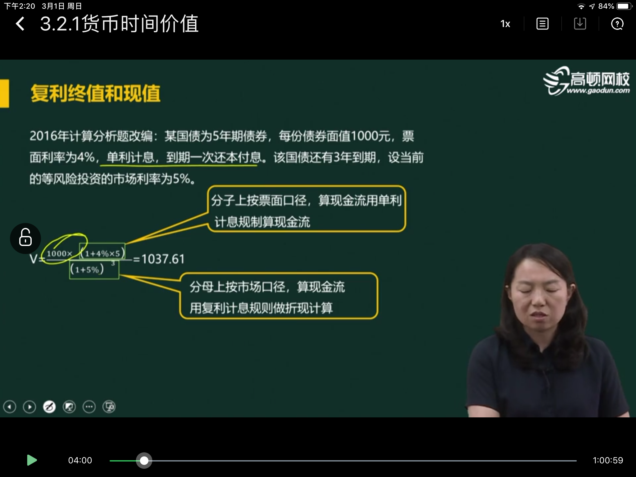 因为题目里面说了是单利计息,所以分子上是按照单利计算的本金和利息,分母上是将未来的本息和折现到当前时点,所以要按照复利的要求考虑货币时间价值。