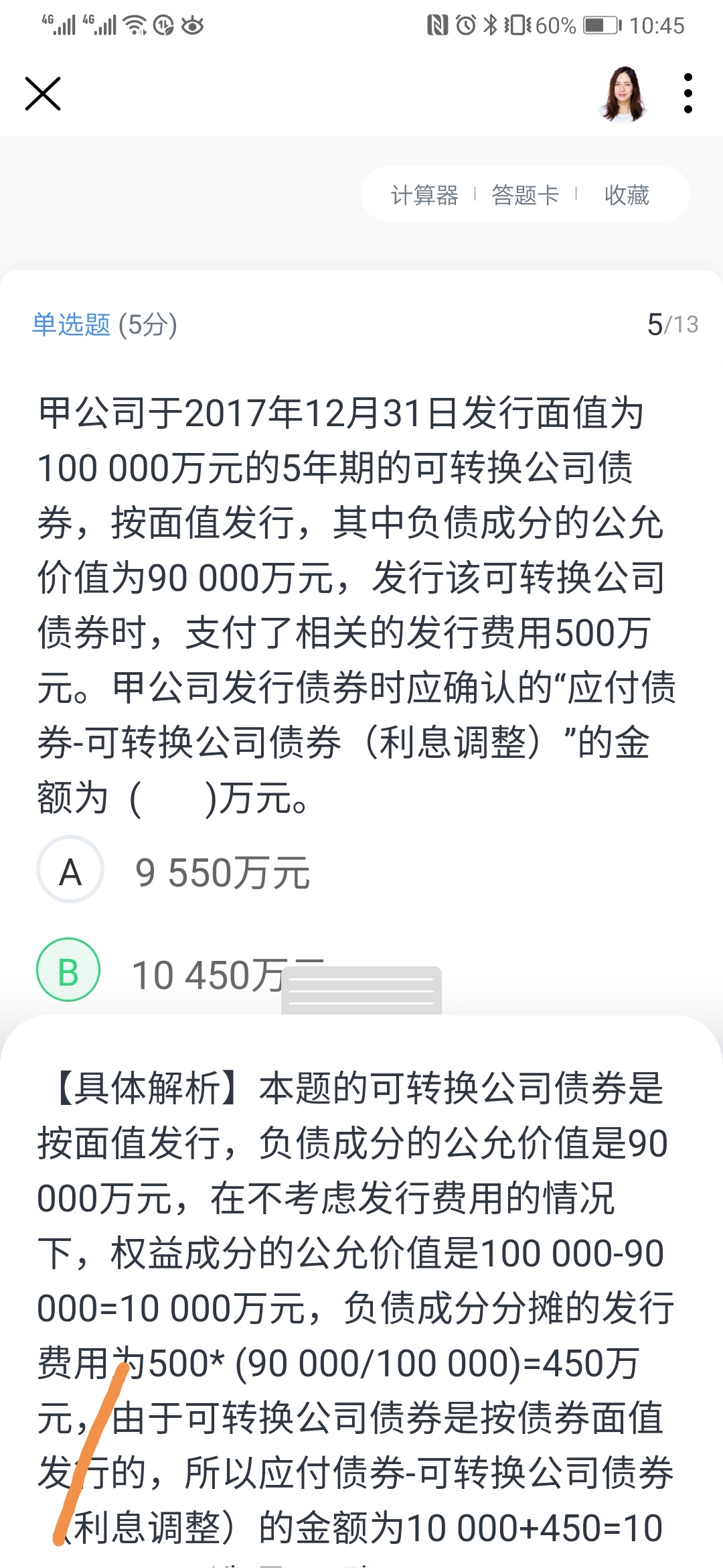 单选第三题,负债成分的利息调整科目应该是公允价值减去分摊的手...