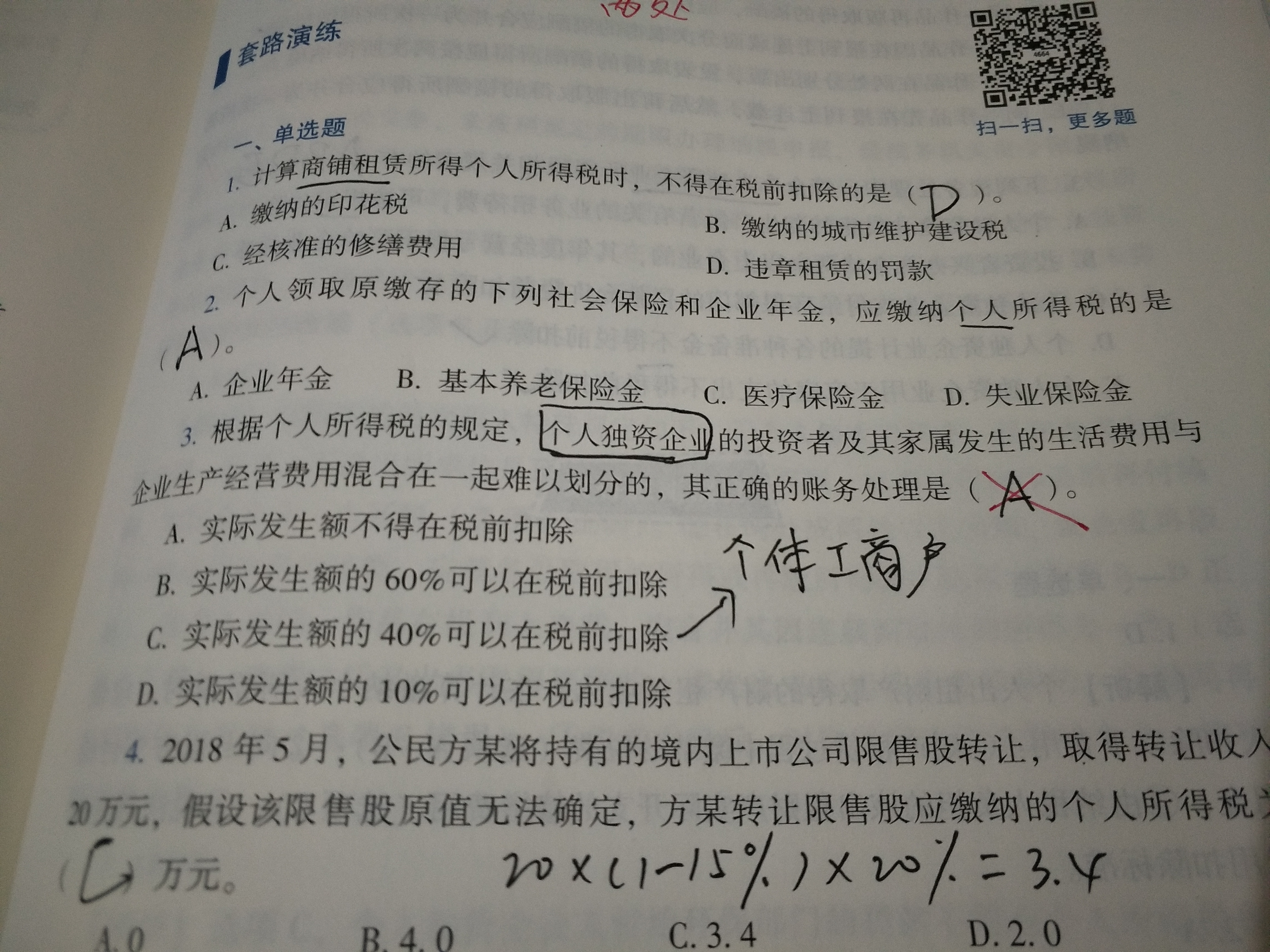 这个第三题的答案不应该是远C吗,个体工商户的才是40%,个人独资企业和合伙企业应该是不得扣除吧