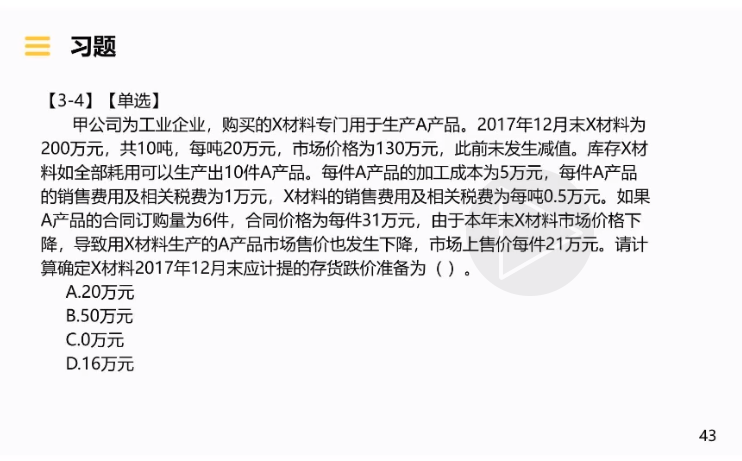 这里的原材料是要加工成产成品的,所以在算减值的时候,就按照产成品的售价来倒求出材料的可变现净值,需要注意的问题,产成品的估计售价有合同的有合同价,没有合同的用市场价,对于6件有合同的产成品来说,估计售价是31,可变现净值=(31-1-5)*6=150,成本=6*20=120,这六件没有发生减值。另外四件估计售价是市场价21,可变现净值=(21-1-5)*4=60,成本=4*20=80,所以存货跌价准备余额=80-60=20,期初存货跌价准备余额=0,所以当期应该计提20存货跌价准备,如果仍有问题,欢迎继续提问,加油哦~