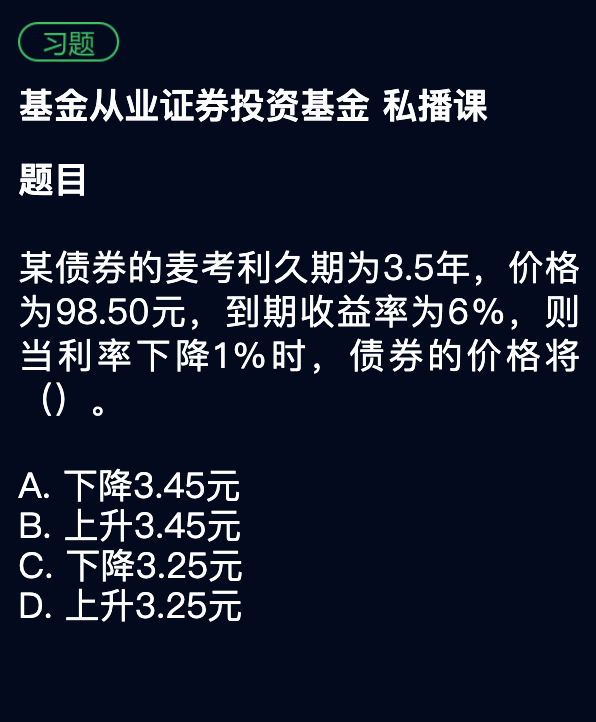 本题考察的是久期的计算,久期的推导过程不要求掌握,只要会代入公式计算即可。