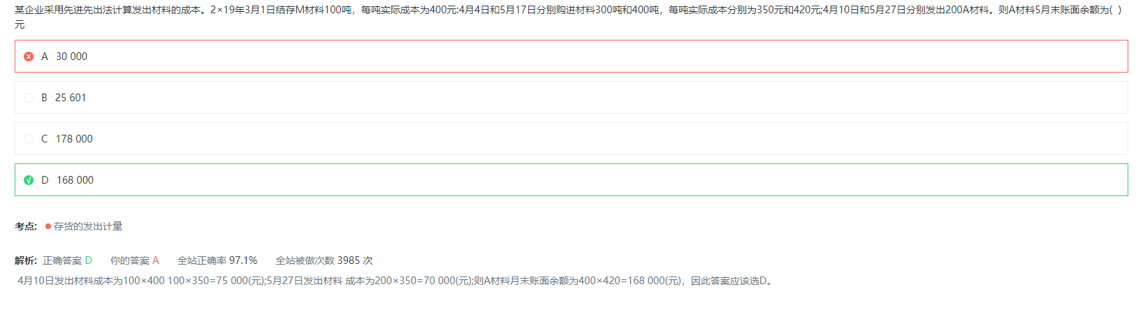 解析里100*400 100*350=750这里的100*350是什么 在4月4号和5月17 号分别购300吨和400吨分别成本是350和420那在4月4号材料不是300*350吗为什么是100*350
