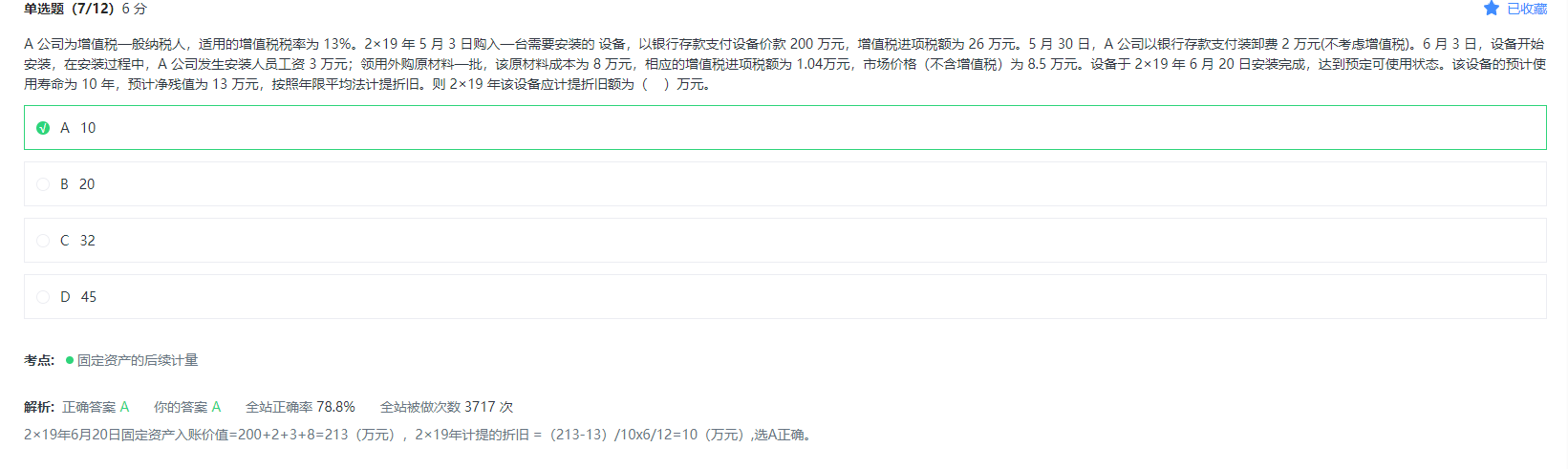 该资产的付账价值213万元,净残值13万元,所以计算折旧的时候用213-13=200,而设备预计可使用10年所有年折旧额(213-13)/10,而2019年6.20才完成安装,所以2019年的折旧只有半年,所以2019年折旧额=(213-13)/10*6/12=10万元。
