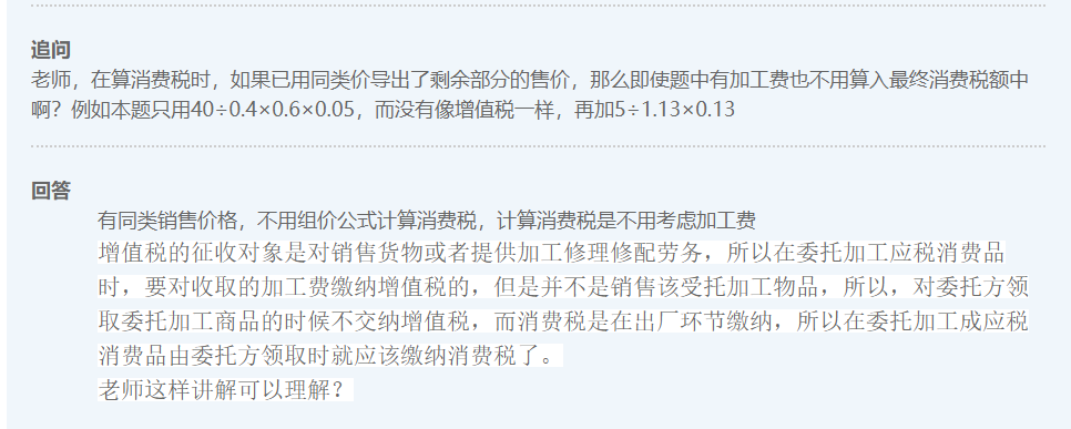 老师您好,这是我之前的提问。老师给我的解答我目前是这样理解的,算增值税时,由于定义要求对加工修理修配劳务征税,受托方一旦提供加工费,就要征增值税。但委托方领用时不用缴纳(我不太理解)。算消费税时,由于出厂环节征税,只要委托方领用就需要征。而无论是增值税还是消费税,使用同类价时就不用算加工费,而用组价时需要算。
