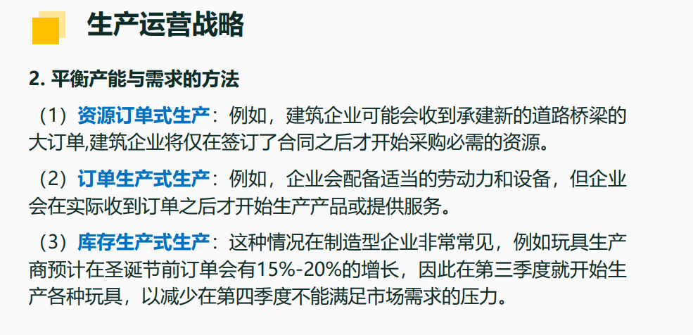 老师您好!问题一:产能计划的含义是“平衡生产能力与市场需求”,那么图片中的标题“平衡产能与需求的方法”是否可理解成“实现产能计划的方法”?问题二:图片中的(1)(2)(3)是三种生产方式,或者说是“买资源”、“生产”和“接订单”三种活动按不同顺序的组合,为什么它们是“平衡产量和需求”的方法呢?换言之,为什么它们能平衡产量和需求呢?