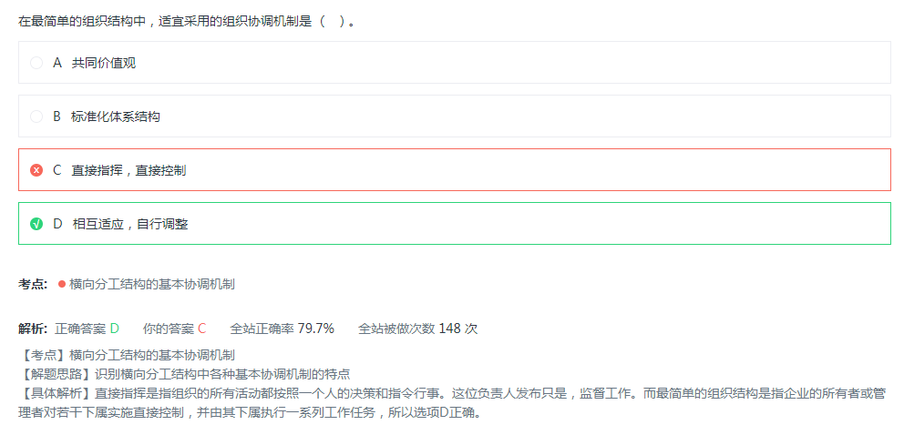 老师你好,这道题题干显示的信息应该是创业型组织结构,那不应该是直接指挥吗?“相互适应自行调整”怎么理解?