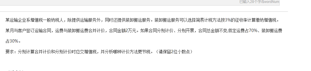 第一种合并计价: 20000*13%=2600元 第二种分开计算: 运费:20000*70%=14000元 ?增值税: 14000*13%=1820元 装卸搬运费:20000*30%=6000元 增值税:6000*3%=180元 合计增值税:180+1820=2000元 第二种计税方法更加节税:2600-2000=600元 老师,这道题这样写对吗