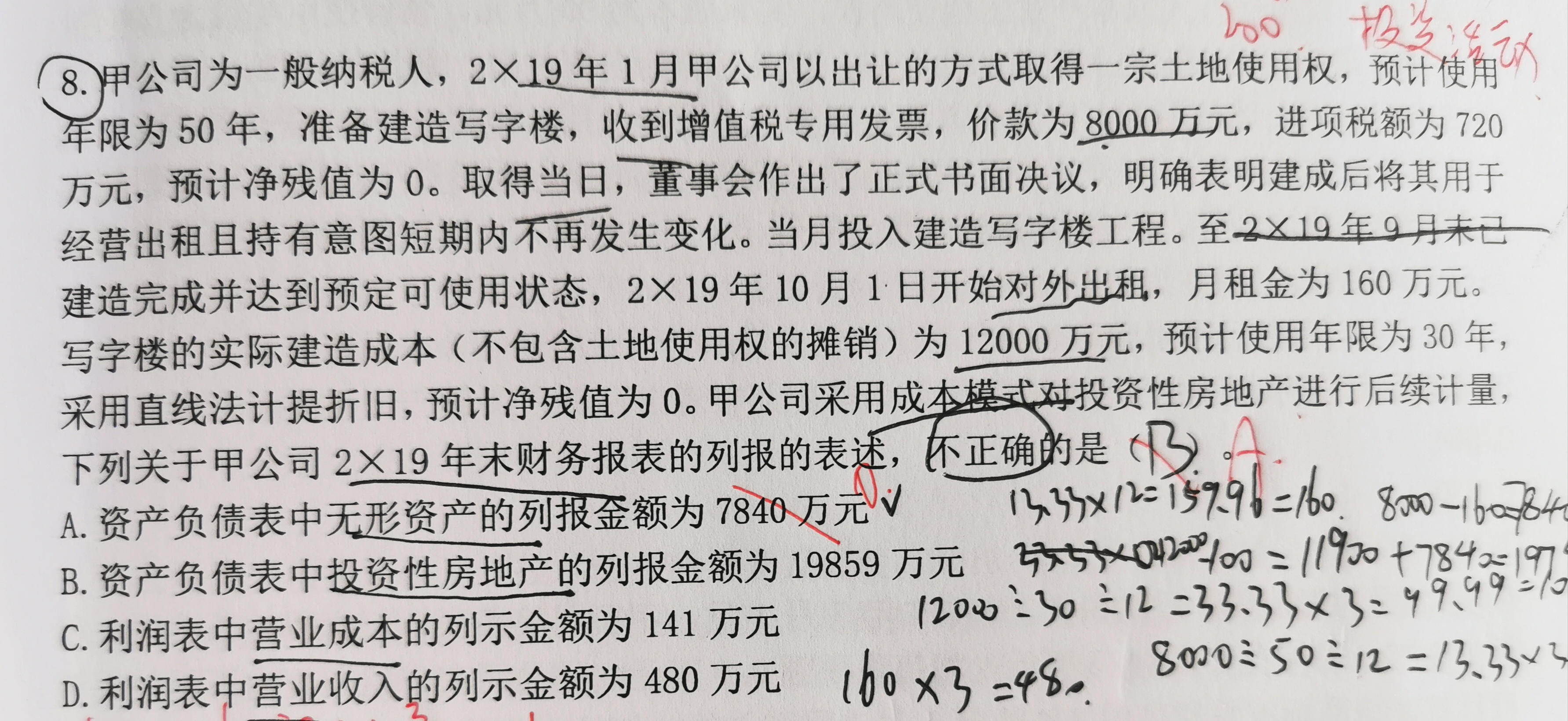 选项B,投资性房地产的列示金额=土地使用权[8000-8000/(50×12-9)×3]+建筑物(12000-12000/30/12×3)=19859.4(万元);【提示,土地刚开始买来就直接转入投资性房地产—在建工程,不摊销】