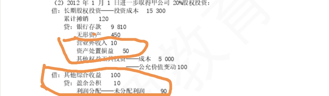 这道题目是实物资产追加投资,原投资是其他权益工具投资,追加投资后形成长期股权投资,此时应当视同为其他权益工具投资和无形资产处置处理,处置其他权益工具投资时,应当将持有期间产生的其他综合收益转入留存收益中,无形资产公允价值和账面价值的差额计入资产处置损益。