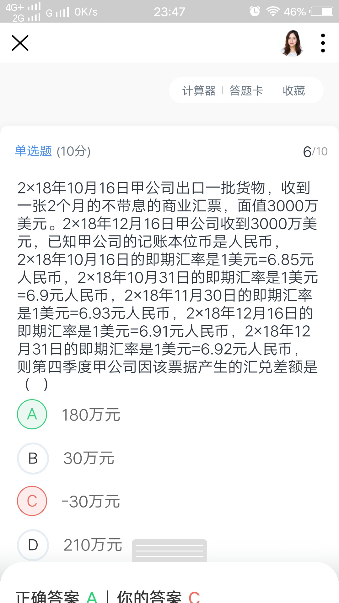 第四季度甲公司因该票据产生的汇兑差额=3000×(6.91-6.85)=180万元。