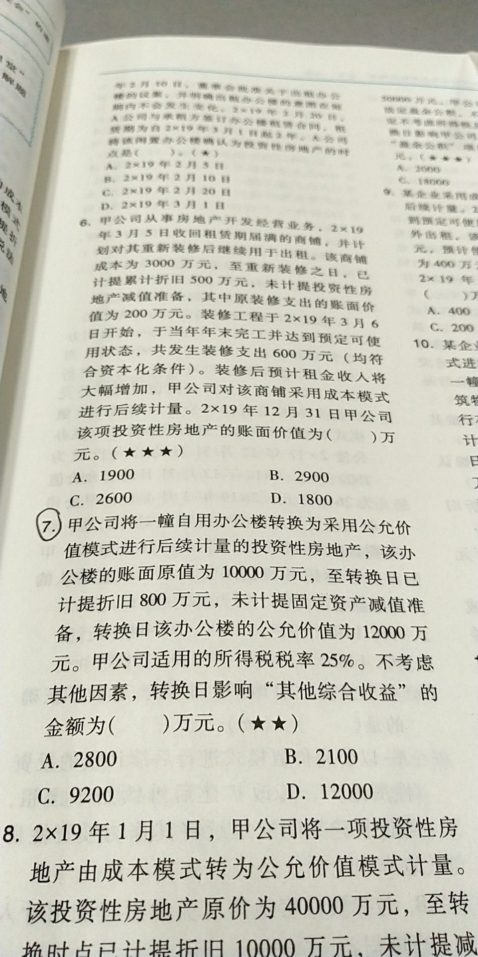 这道题目中涉及到了企业所得税的问题,所以需要考虑递延所得税资产或负债,固定资产转换为投资性房地产,按照公允价值进行入账,此时账面价值为12000万元,在税法角度,其核算方法的转换不影响其计税基础,此时计税基础9200万元,会产生应纳税暂时性差异,确认递延所得税负债,对应科目为其他综合收益,所以需要减去递延所得税负债产生的其他综合收益。