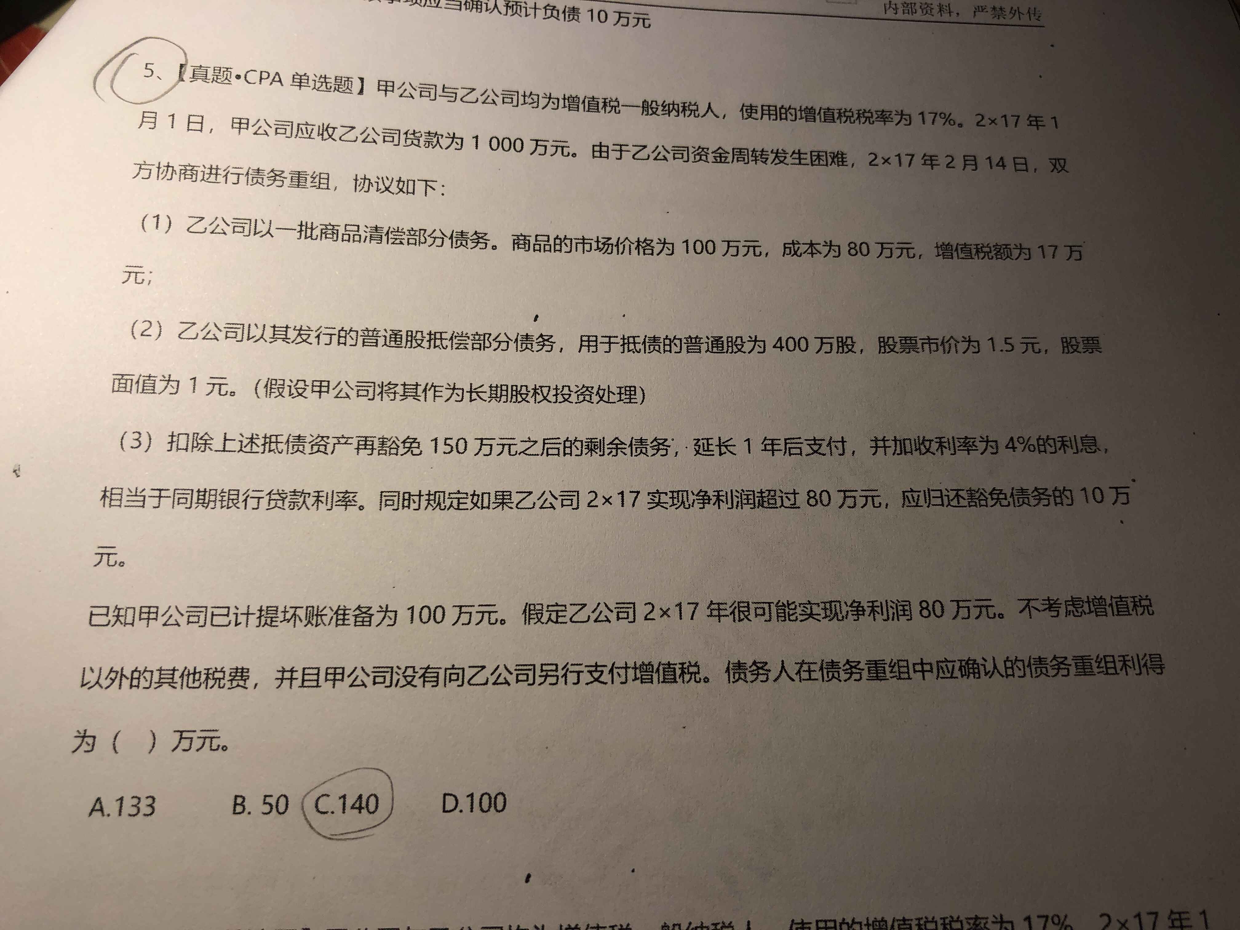 但是由于估计的条件,今后还要付10,即免了140,这140就是债权人不要了,因此就是债务人的利得