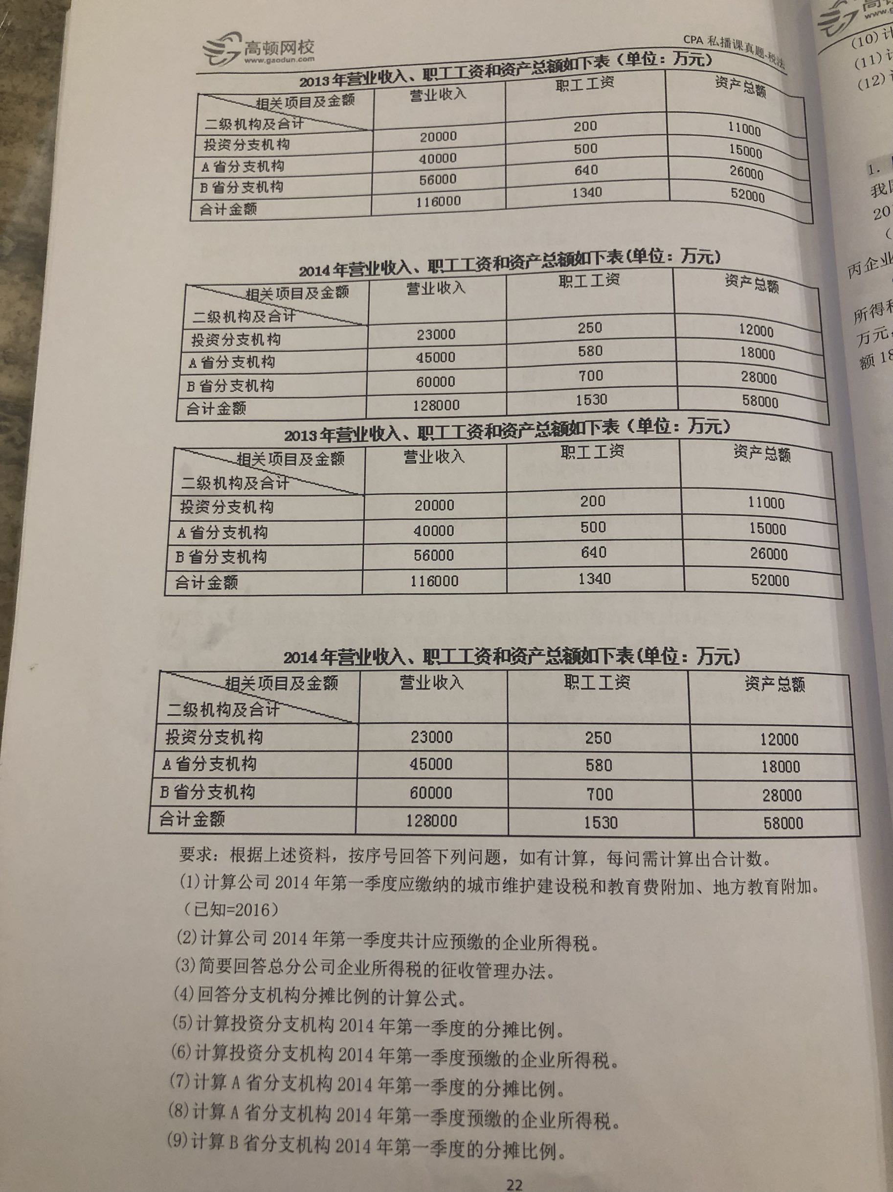 计算分摊比例要用上年度分支机构的三个因素,因此要用2013年的数据。