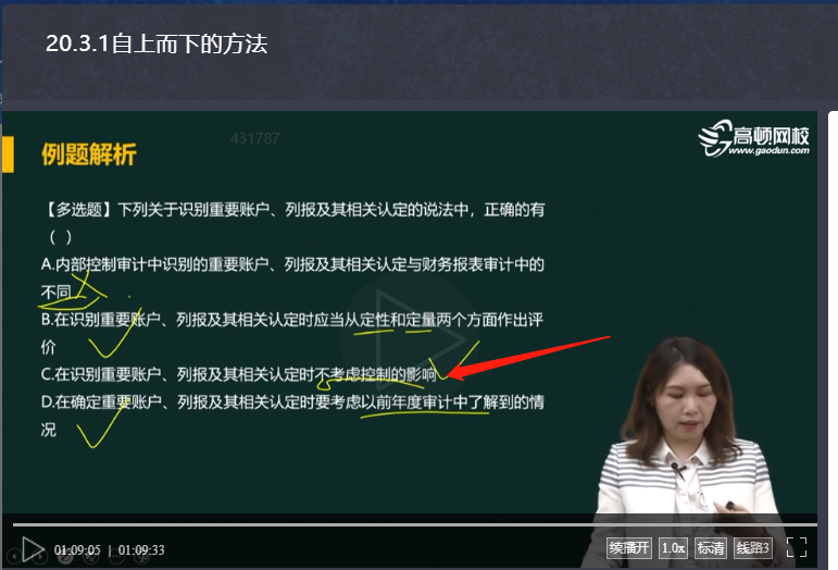 您好老师,这道题答案C,我认为不太严谨,我认为在题干中 应当有这样的描述,在内部控制审计中,下列关于识别......,正确的有()