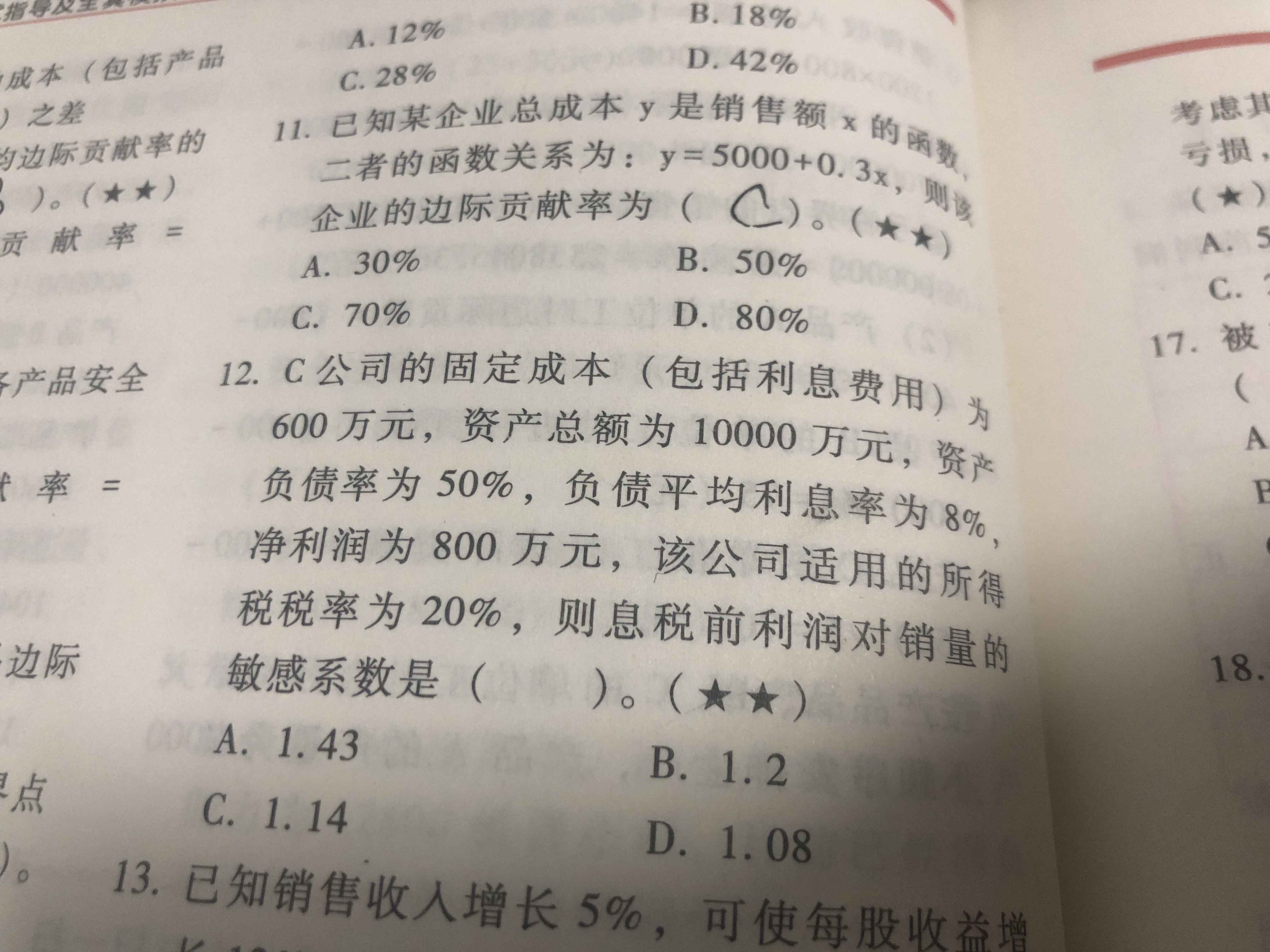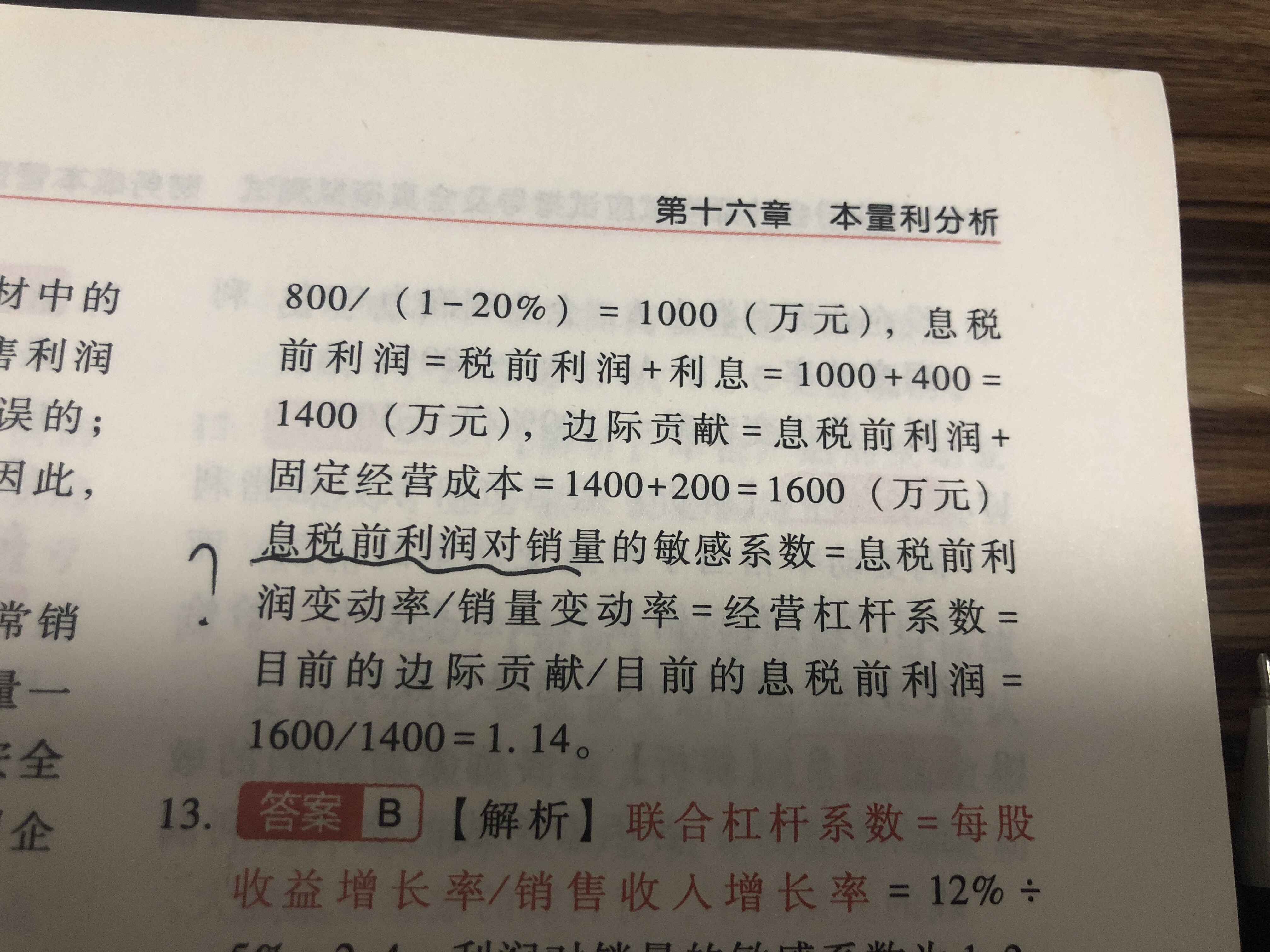 这里是对公式的综合运用,经营杠杆系数=息税前利润变化百分比/营业收入(销售量)变化百分比=息税前利润对销量的敏感系数,所以这里的敏感系数可以用经营杠杆系数来求解,也就是等于M/EBIT,当前的边际贡献/当前息税前利润。希望可以帮助到你哦~加油~