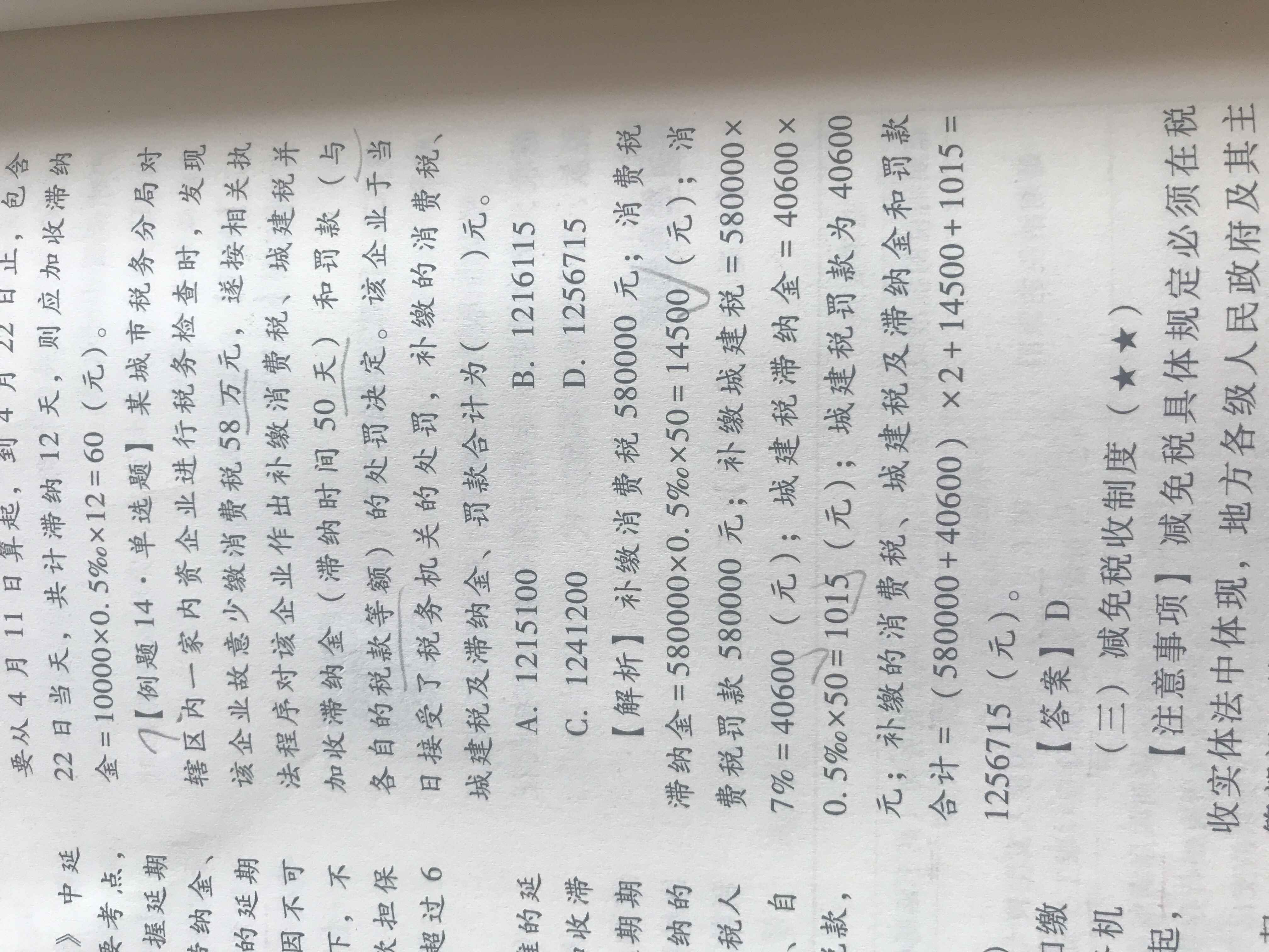 需要补缴的消费税为58万,那么这个消费税肯定得交滞纳金,,城建税,教育费附加以及地方教育附加是以消费税和增值税为计税基础的,因此也需要补缴城建税580000*0.07=40600万,之所以答案里乘了2,是因为税务机关可以在50%-5倍之间核定罚款额度,所以题目中已告知是等额罚款
