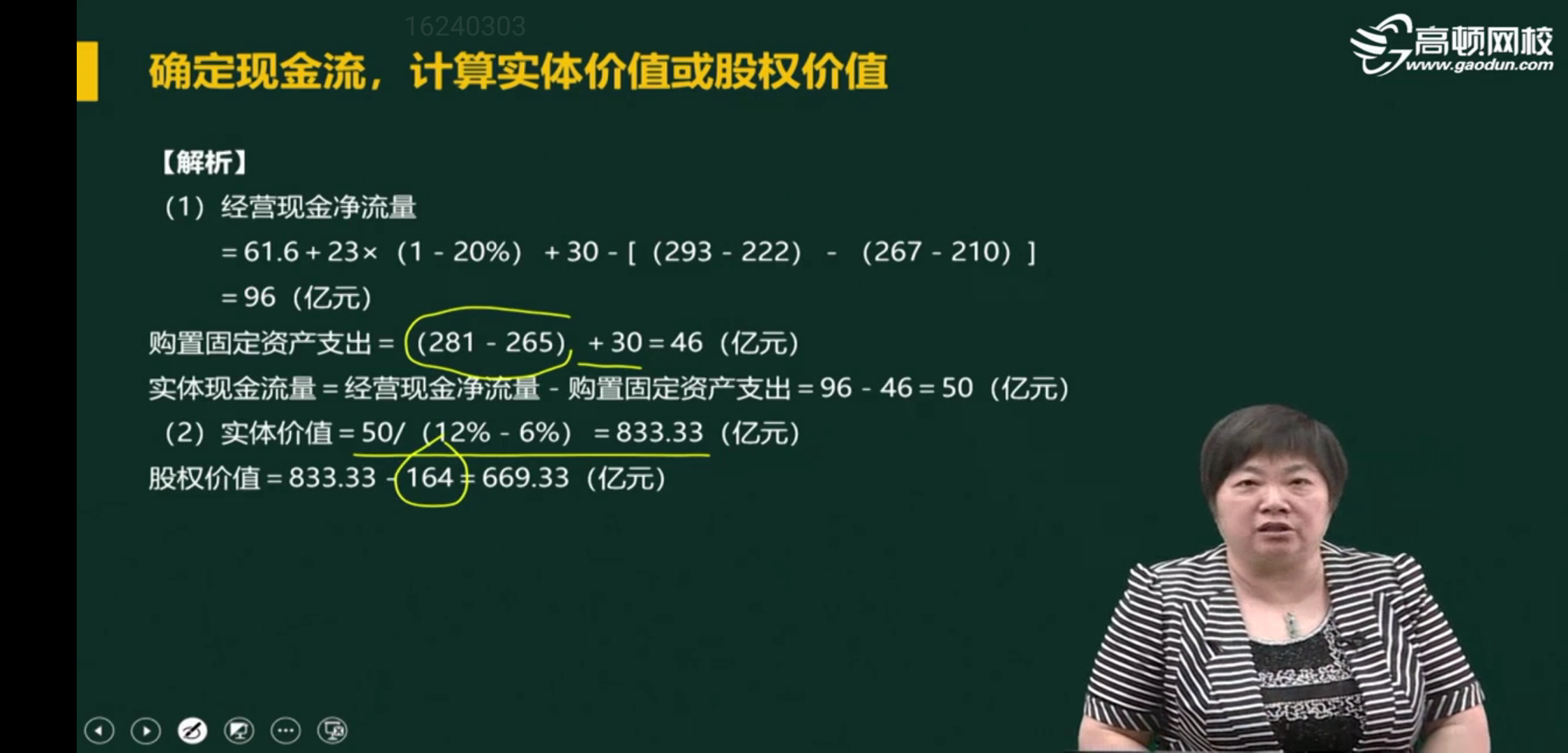 利用固定股利增长率模型折现,实体价值=实体现金流/(rs-g)=50/(12%-6%)=833.33