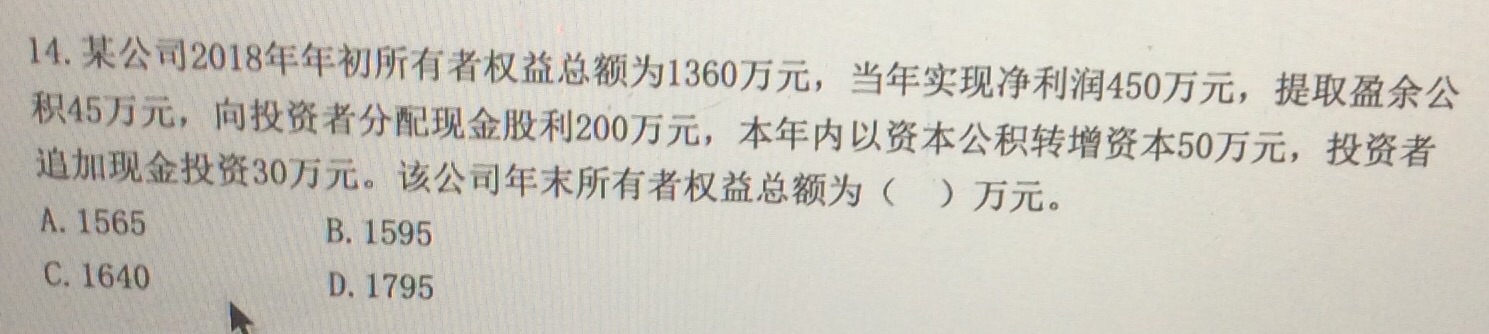 以资本公积转增资本50万元、提取盈余公积45万元是所有者权益内部项目的变化,并不影响所有者权益总额,向投资者分配现金股利200万元减少所有者权益总额,实现净利润450万元、接受现金投资30万元增加所有者权益,因此该公司年末所有者权益总额=1360+450+30-200=1640(万元)。