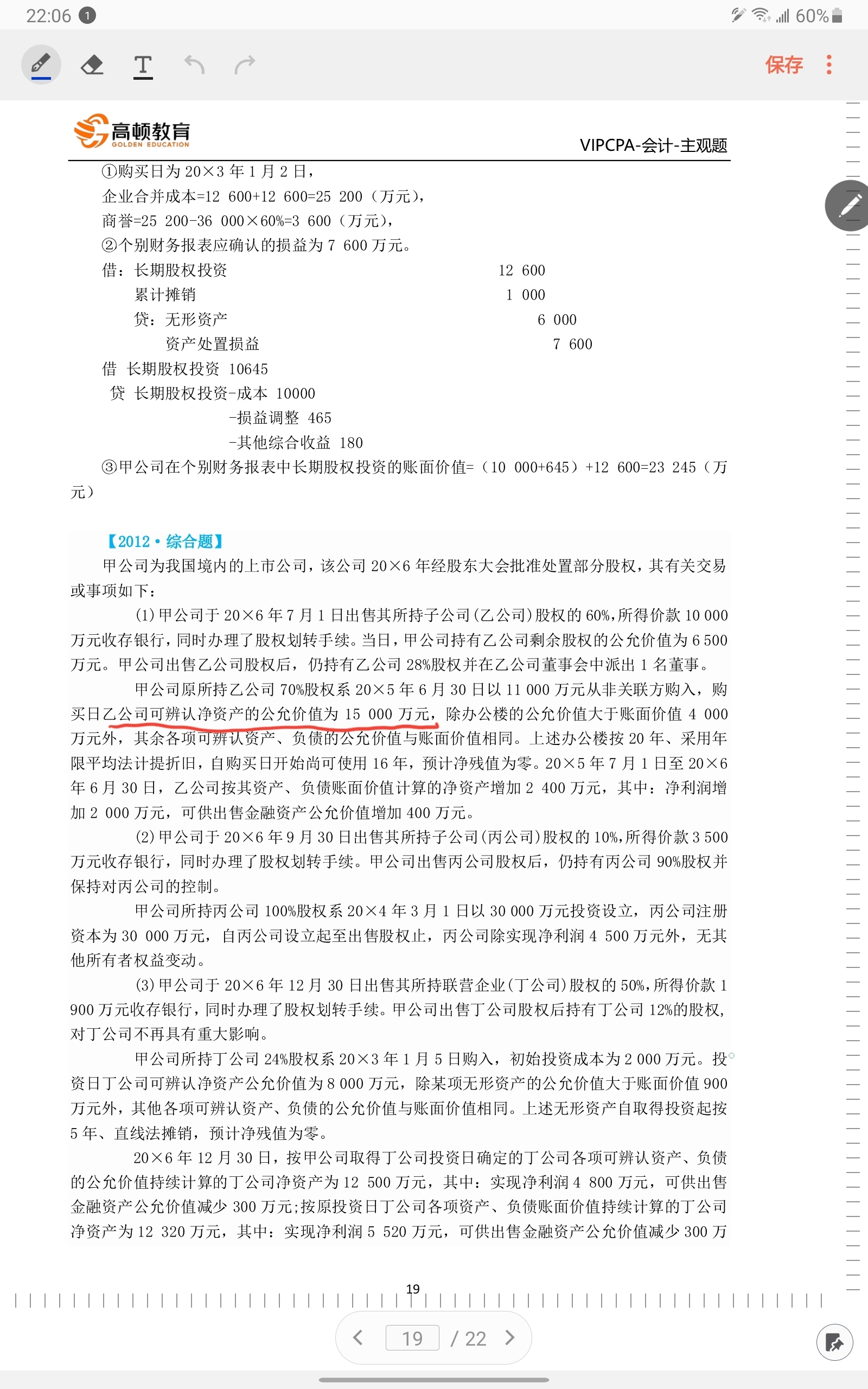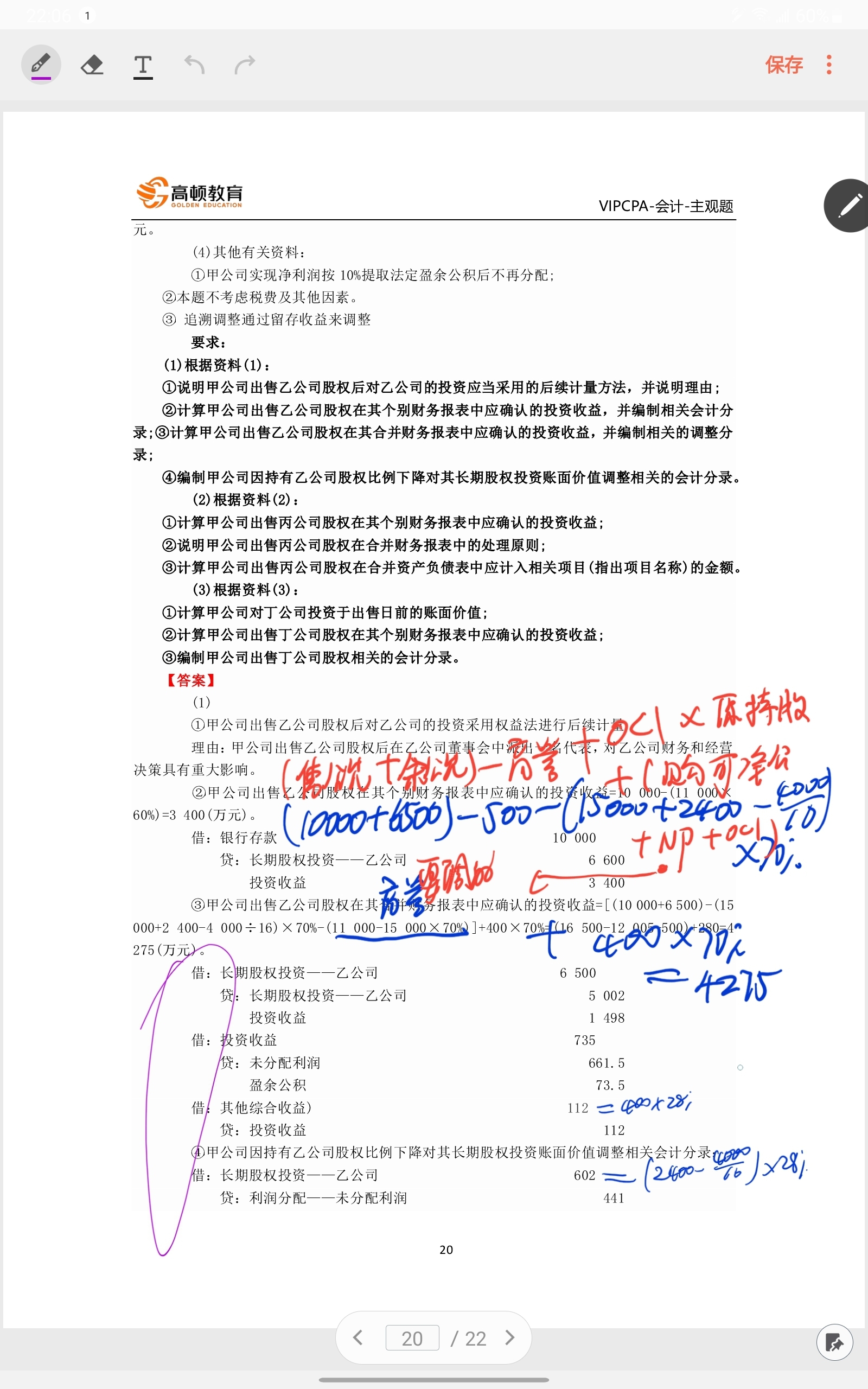 ③的第一笔分录是视为把剩下的28%的长投卖掉的分录,借方是28%长投的公允,贷方是28%长投的账面4400+602=5002。第二笔分录是把个报上确认的投资收益3400的归属期间进行调整,因为个报上确认3400的投资收益的时候,贷方的长投是成本法的长投,所以导致投资收益记多了,这3400里面有一部分是以前期间的,所以需要恢复。第三笔分录是把成本法下没有调整的其他综合收益转走,因为合报上我们是为把70%的股权全部卖掉了,所以小尾巴也要转走。