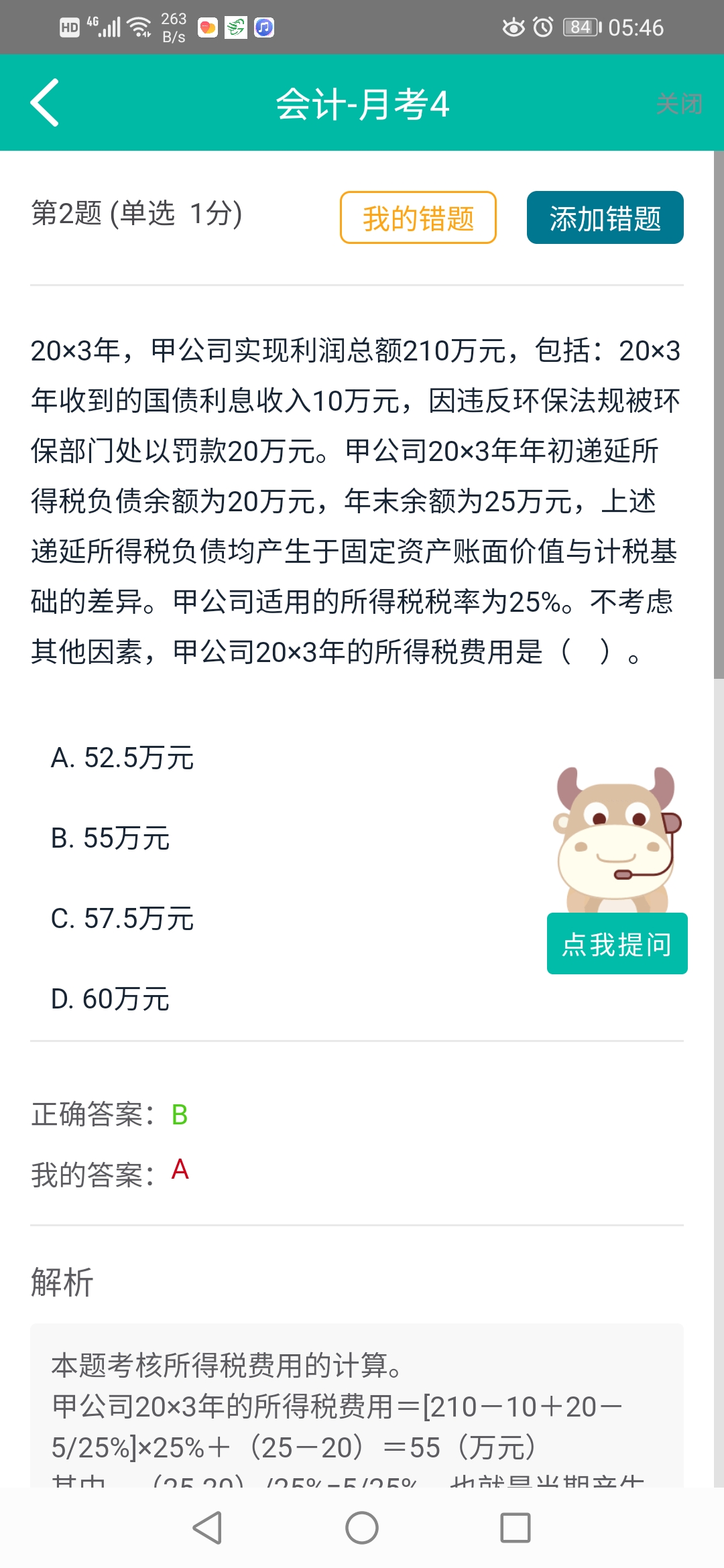 (3)所得税费用=当期所得税+递延所得税费用,当期所得税=应纳所得税*25%=(210利润-10(国债利息免税)+20(环保罚款不能扣)-5/25%(固定资产账面价值和计税基础不等))*25%,递延所得税费用=递延所得税负债-递延所得税资产=5。