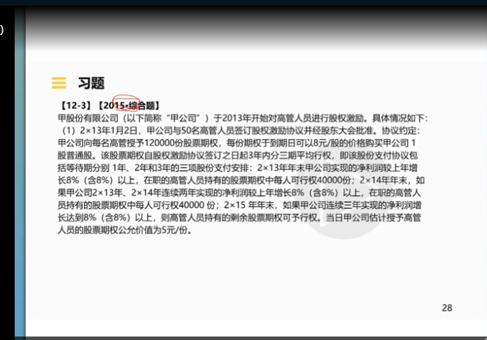 老师,就这题2015年的综合题,我不是很明白,将12000份分成3份,然后第一年满足条件可行权4万份,第二年满足条件可行权4万份,第三年满足条件可以行权4万份。为什么再算2013年的时候,就管第一份就可以了啊,为什么还要考虑后面的2份,我绕不过弯了、听剩余的第二份,第三份不是要分别在第二年和第三年才行权吗,为什么第一年我要考虑后面的2份。