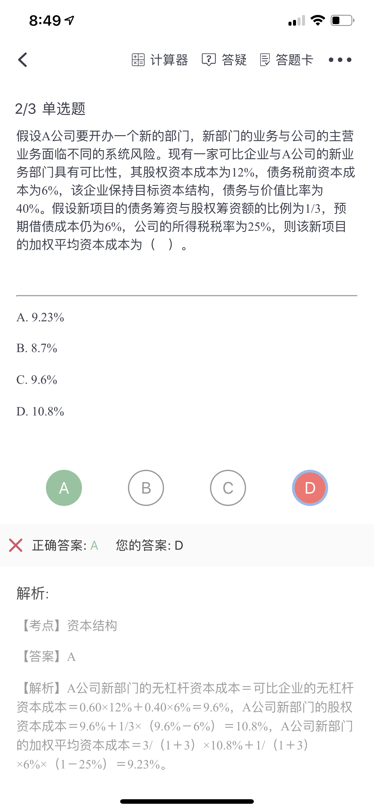 目标公司有杠杆的加权平均资本成本=(3/4)×10.8%+(1/4)×6%×(1-25%)=9.23%。