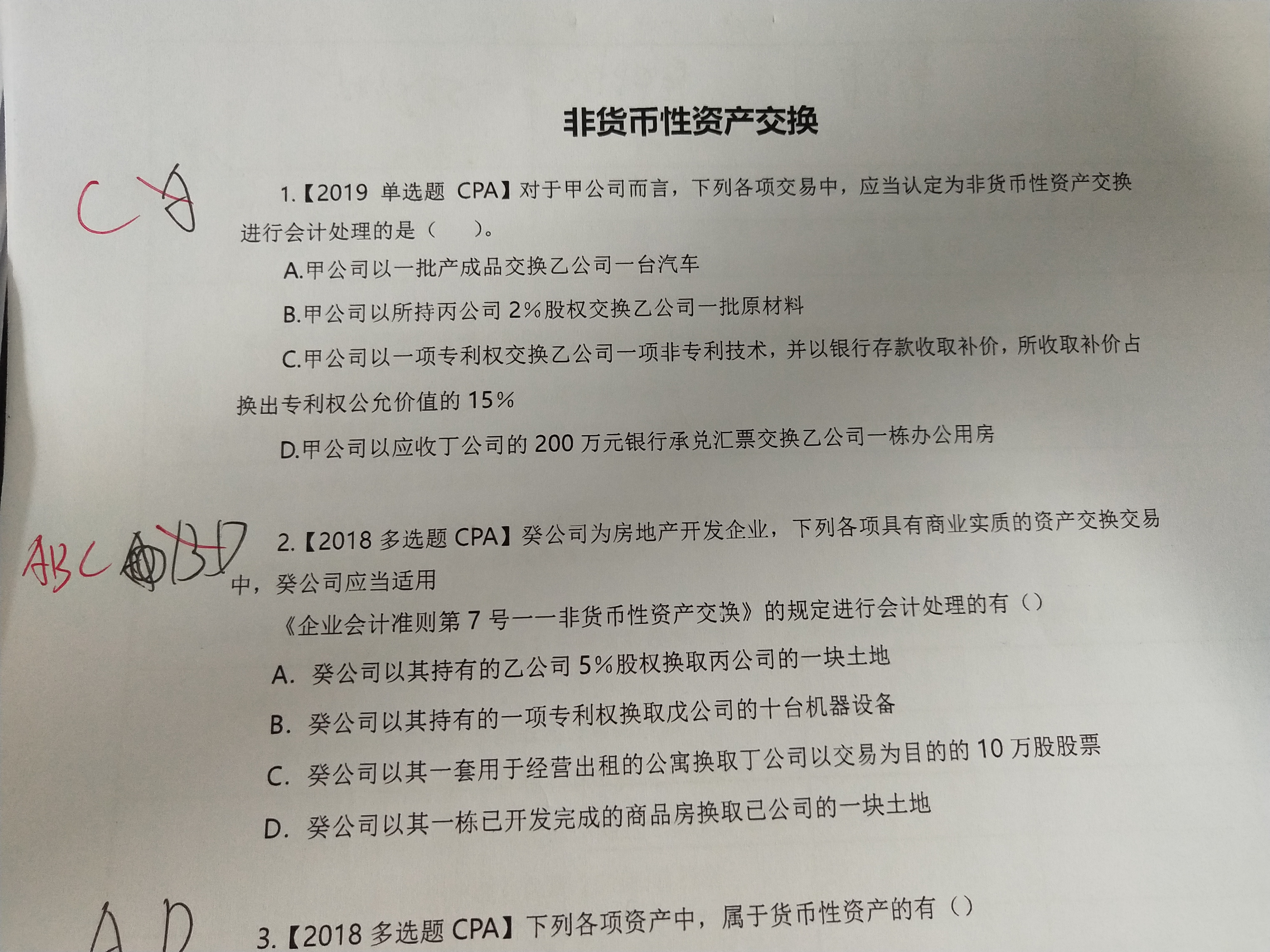 您好 1,我觉得第一题B选项和第二题A矛盾 2,第二题,换出资产是固定资产,无形资产,投房才满足7号准则,那么A为啥选啊,B换出无形资产,C换出投房,D换出存货是吧