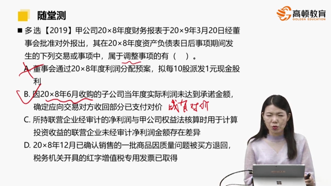 B选项,企业只有在18年过完的时候才能够知道子公司有没有达到承诺的金额,那不是资产负债表日后才确定的吗?为什么属于调整事项?不太明白