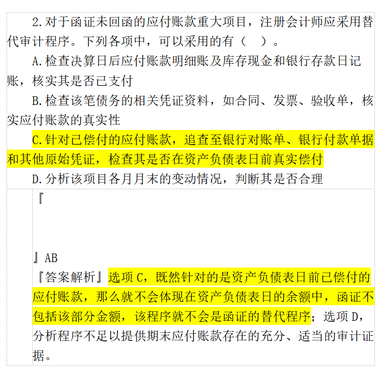 辛苦老师答疑:题干说“函证未回函的替代程序”,函证应该是既可以针对存在,也可以针对完整性吧(积极方式)?选项C,针对是否有漏记低估,为什么不正确呢?