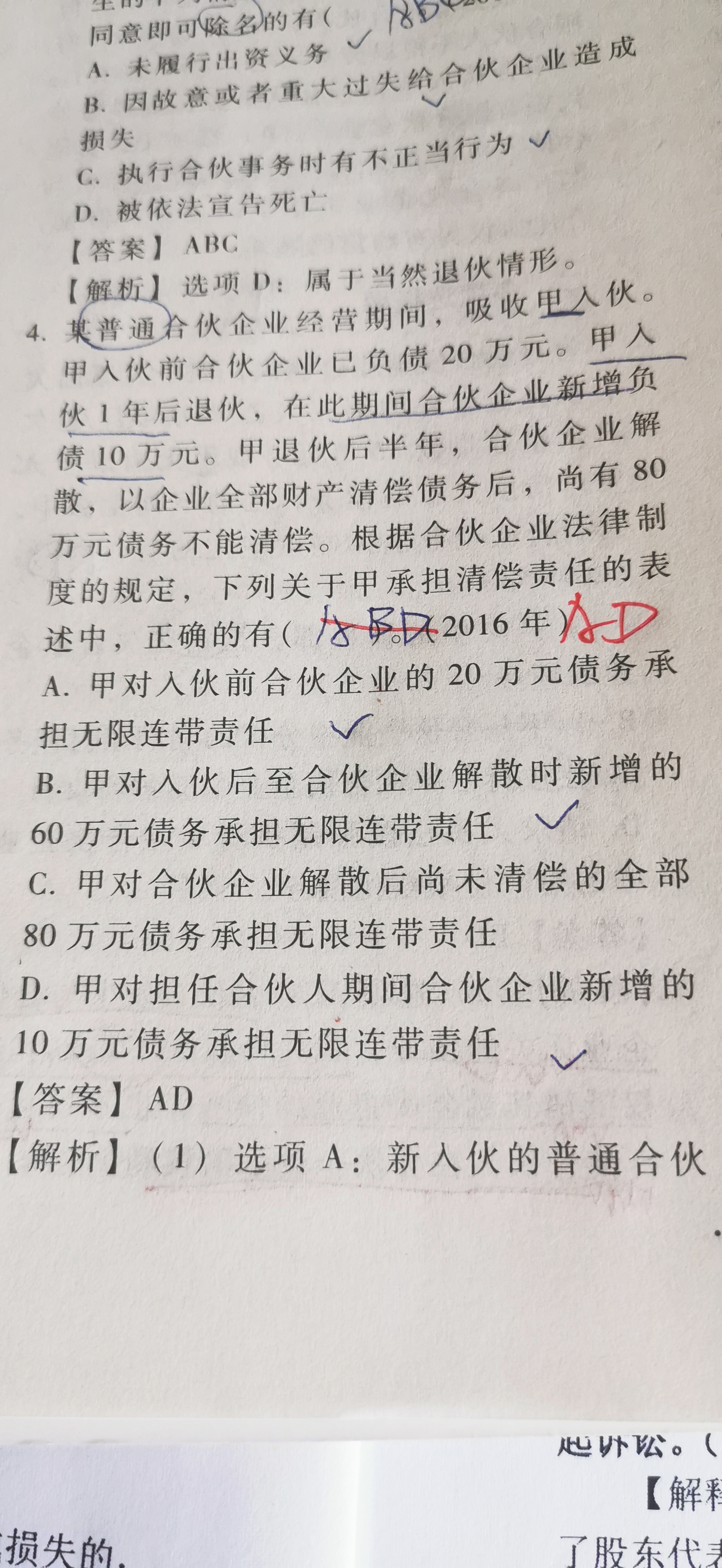 因为甲退伙了呀,甲退伙后,对退后以后的债务就不用承担责任,所以b不对。