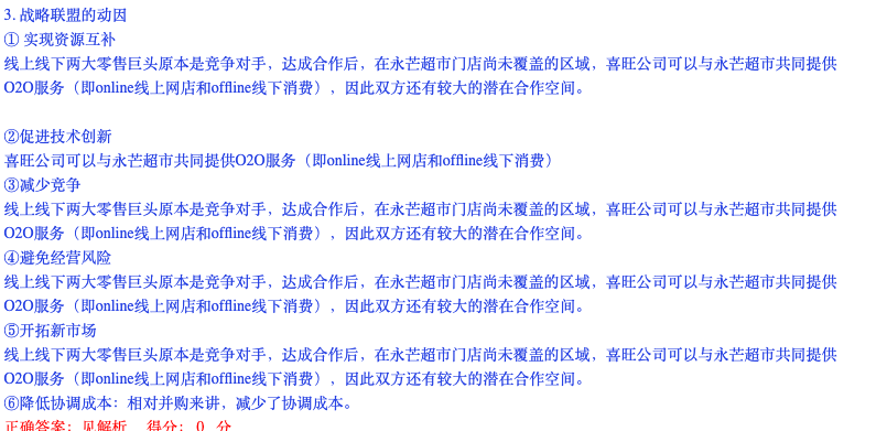 老师,您好。图片一:这个企业新建了很多其他产业的公司,不属于多元化战略吗?我除了写一体化之外,还写了多元化,如果是这样,老师判卷会认为我理解的不对少给分吗?图片二:我把战略联盟动因都写了,但是答案没有,而且基本上这些点都对应的是那句原文,这样多写是不是也不太好。图片三:题目让分析优势劣势,一开始优势确实没有找到,但是看到最后一句原文,感觉和优势都有点像。