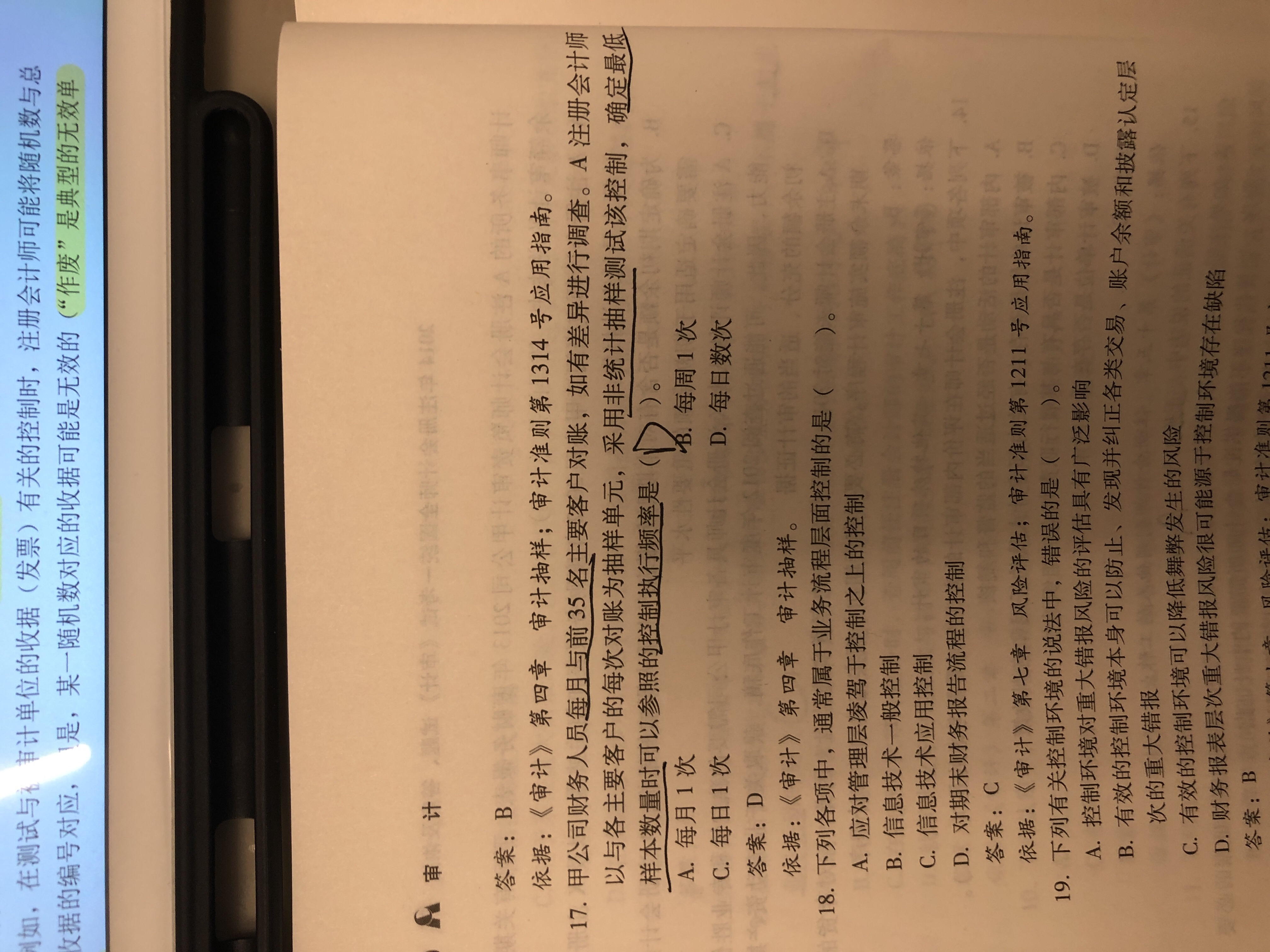 郑同学控制发生的总次数=35×12=420,大于 250 次,根 据人工控制最低样本规模表,控制的执行频率应当是每日数 次。