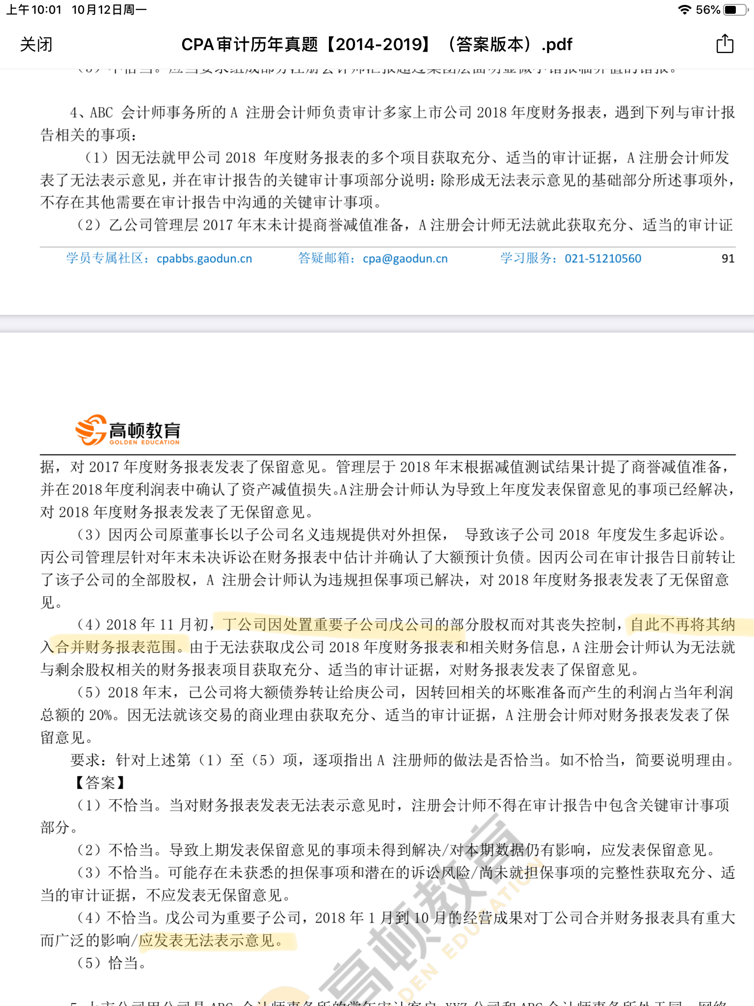 本题第(4)小问属于审计范围受限,因为丧失控制权,导致无法获取相关的审计证据造成审计范围受限;然后看影响是否广泛,广泛的话出具无法表示意见;