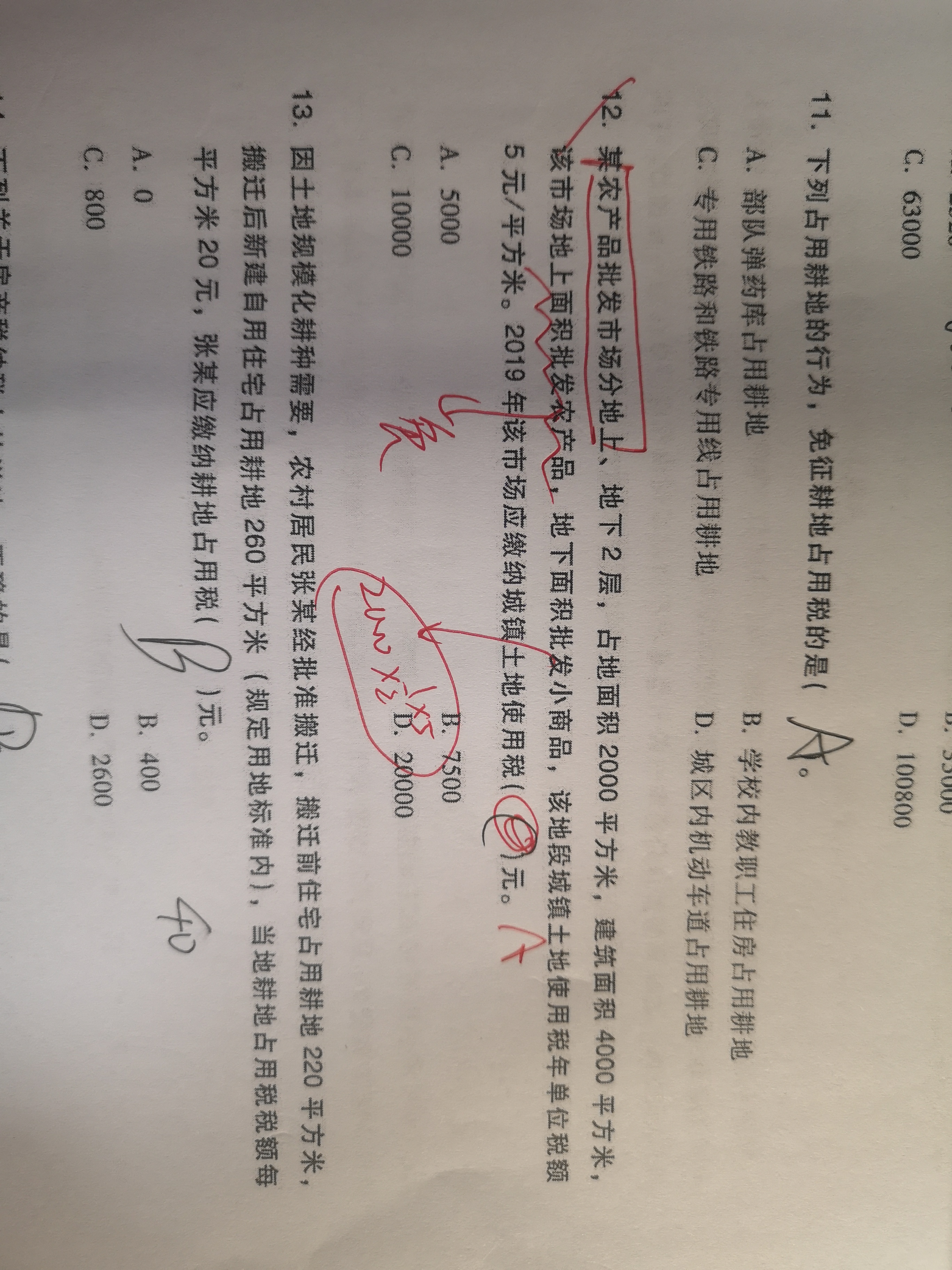 老师好,第12题 地上面积批发农产品免税,我没有理解2000*1/25 中这2000是城镇土地使用税按土地面积来计算 还是建筑面积4000/2 来计算