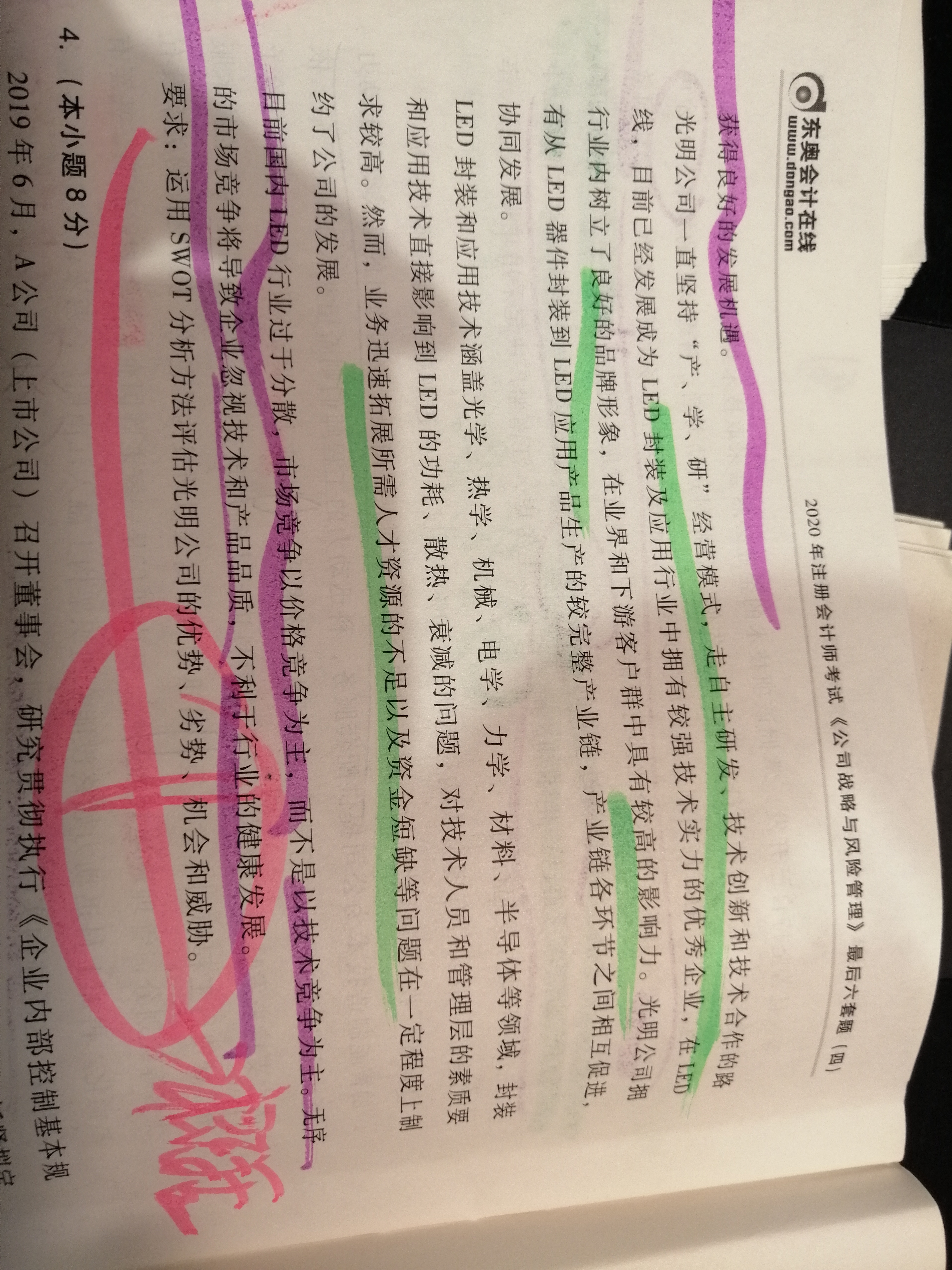 老师好做图片上这种题,你比如说运用SWOT分析方法评估光明公司的优势,劣势,机会和威胁。 比如说我把优势,劣势,机会,威胁都给他写上之后啊,我不能单纯地从这个文章里边儿找句子原封不动的给他抄上,而是要把这个句子进行概括,把关键词要写上是这样,对吗?