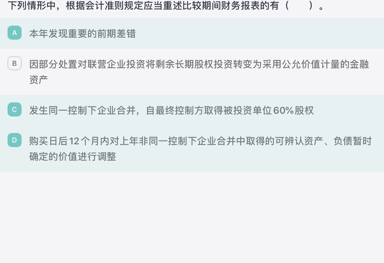 选项C,合并报表章节特殊交易部分,同控合并,视同合并双方在同时处于最终控制方控制下之日起即处于当前状态,可理解把合并事项提前至合并双方在同时处于最终控制方控制下之日确认;