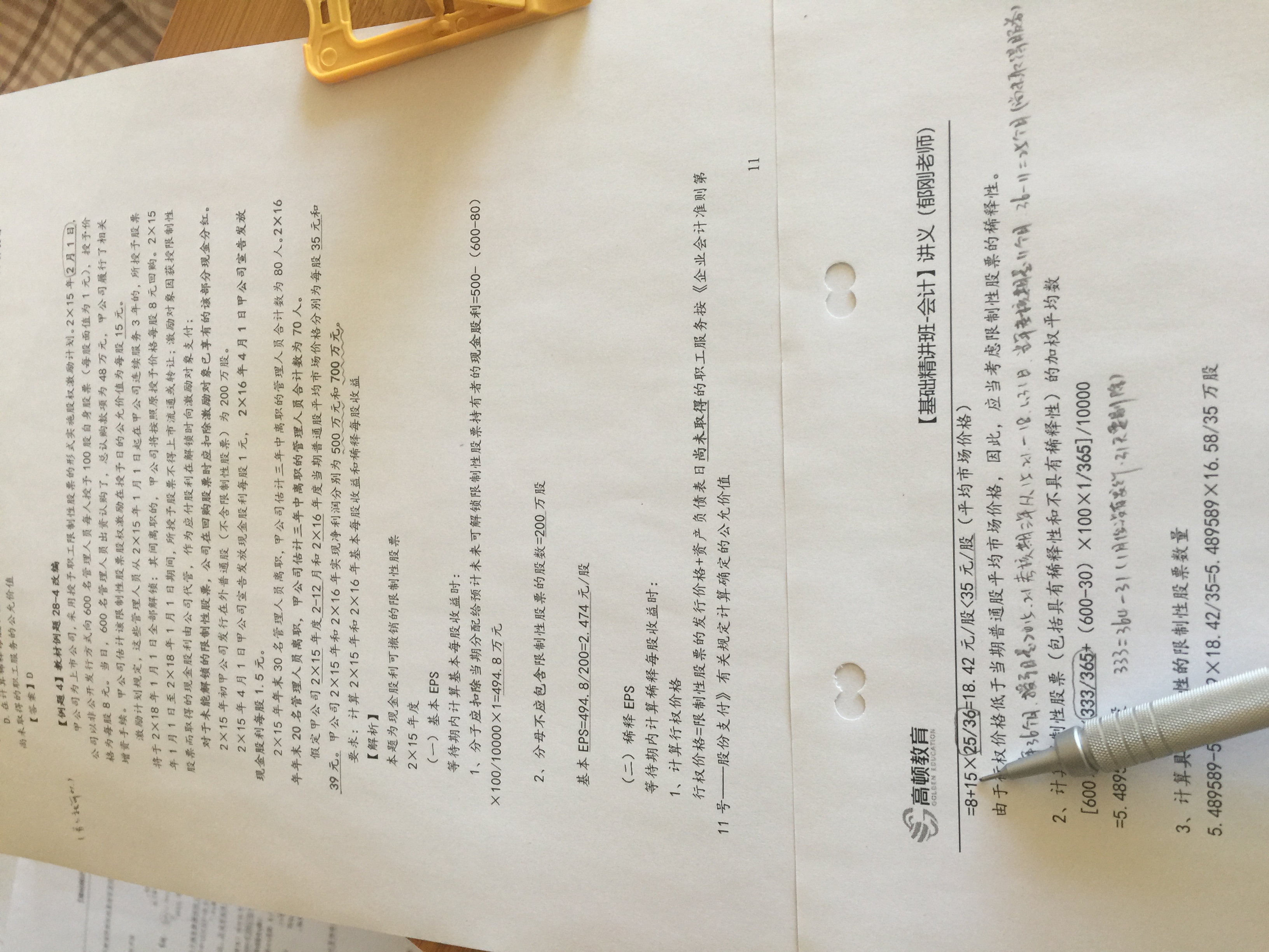 在计算每股收益时,由于员工已经支付了11个月的劳动力,所以还需要划分25个月的劳动外加8元的认股价格,才能够获得普通股,故行权价格=8+15*25/36=18.42元。