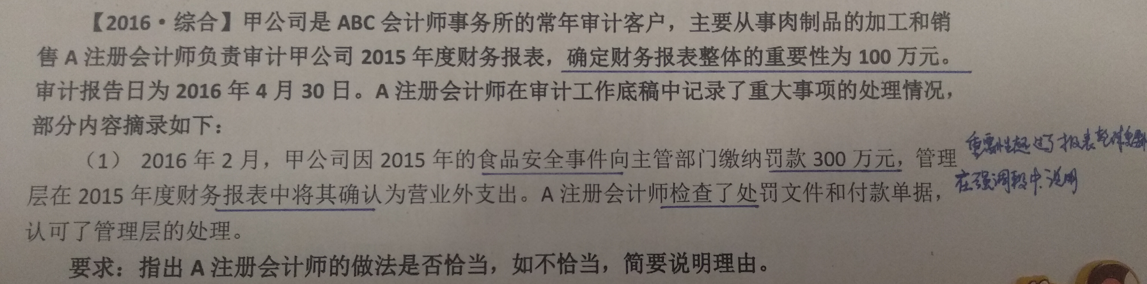 虽然罚款金额比较高,并且超过了财报的整体重要性,但是企业做了正常的处理,计入到了营业外支出,是一项正常的核算。并且注册会计师检查了支持性单据,所以做法没有不恰当之处。