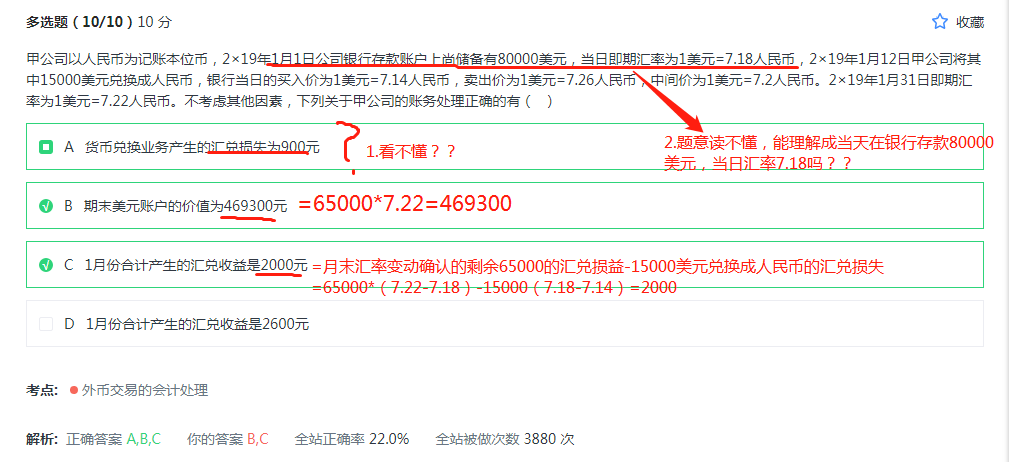 红色方框标出来的解析,看不懂,1500美元兑换人民币,跟中间价有什么关系?,麻烦老师帮我解决下另一张图片上标出来的1和2两个疑惑?谢谢,另外我的答案C选项解题思路是正确的吗