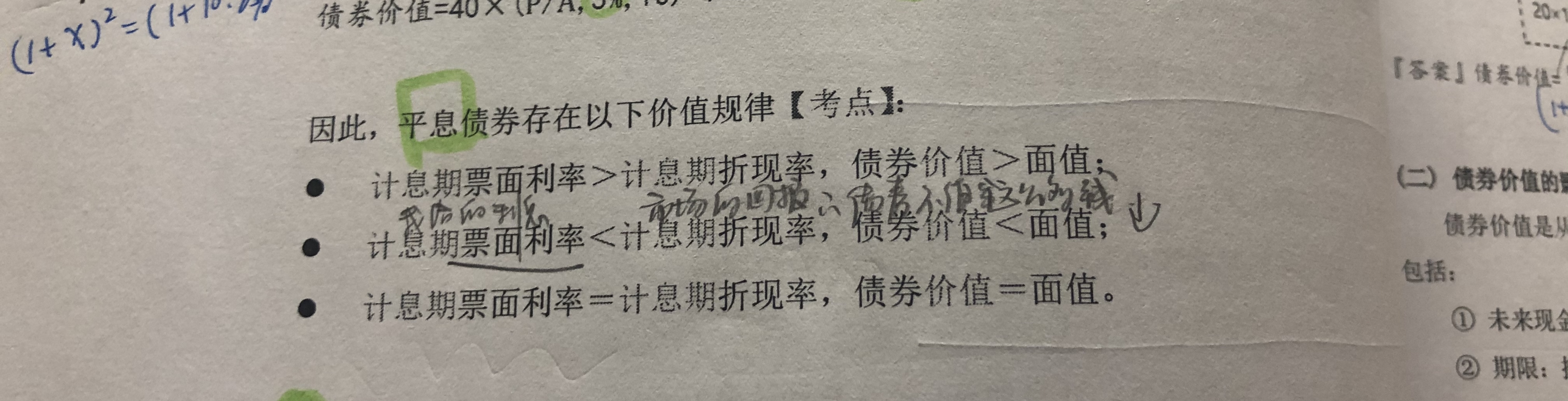 右边的图片说:计息期折现率<计息期票面 利率,债券价值>面值 ;对应公式1